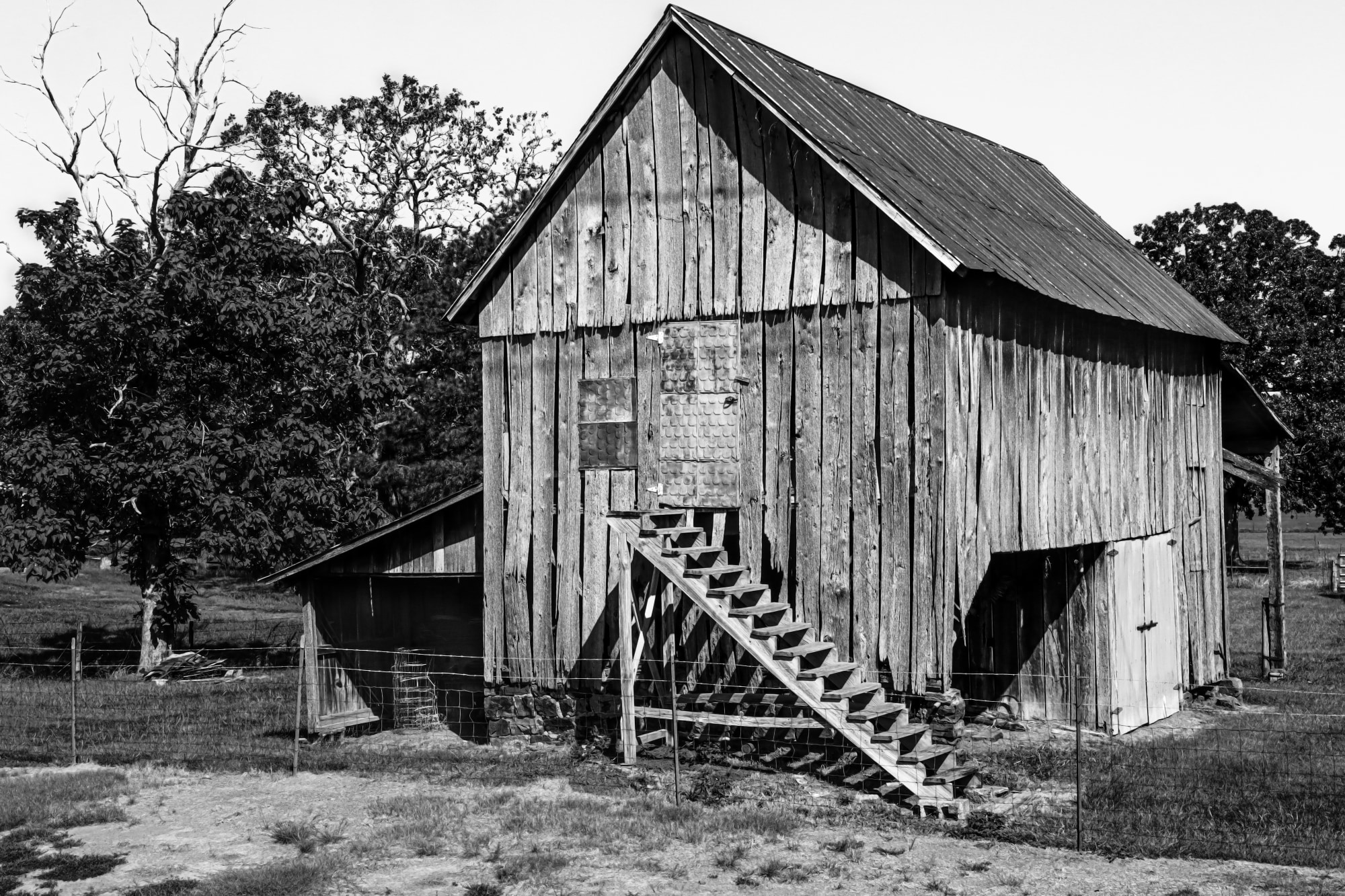 The Roughened barn is unusual for the lack of front entrance and an upstairs you reach from the outside without railing.