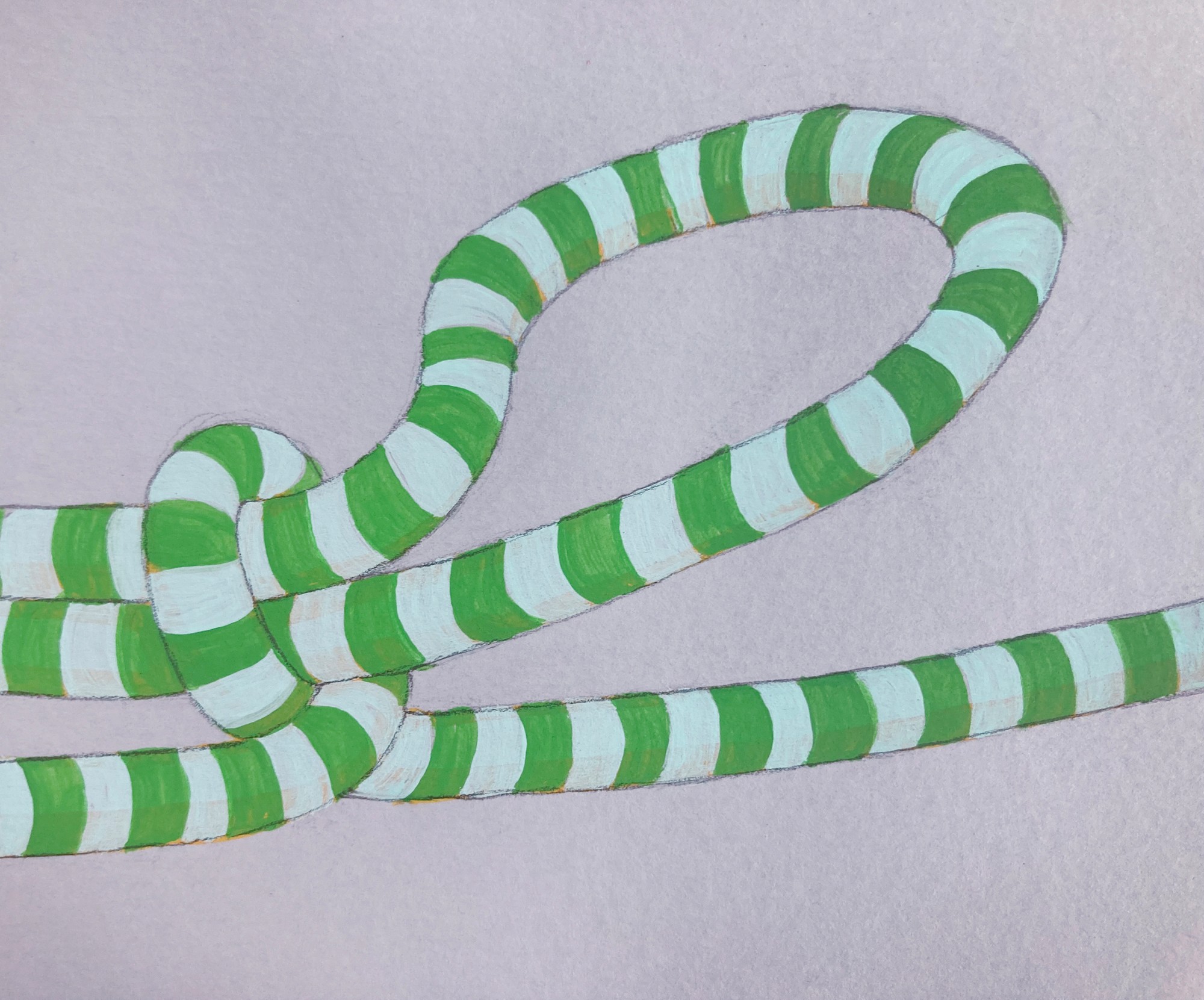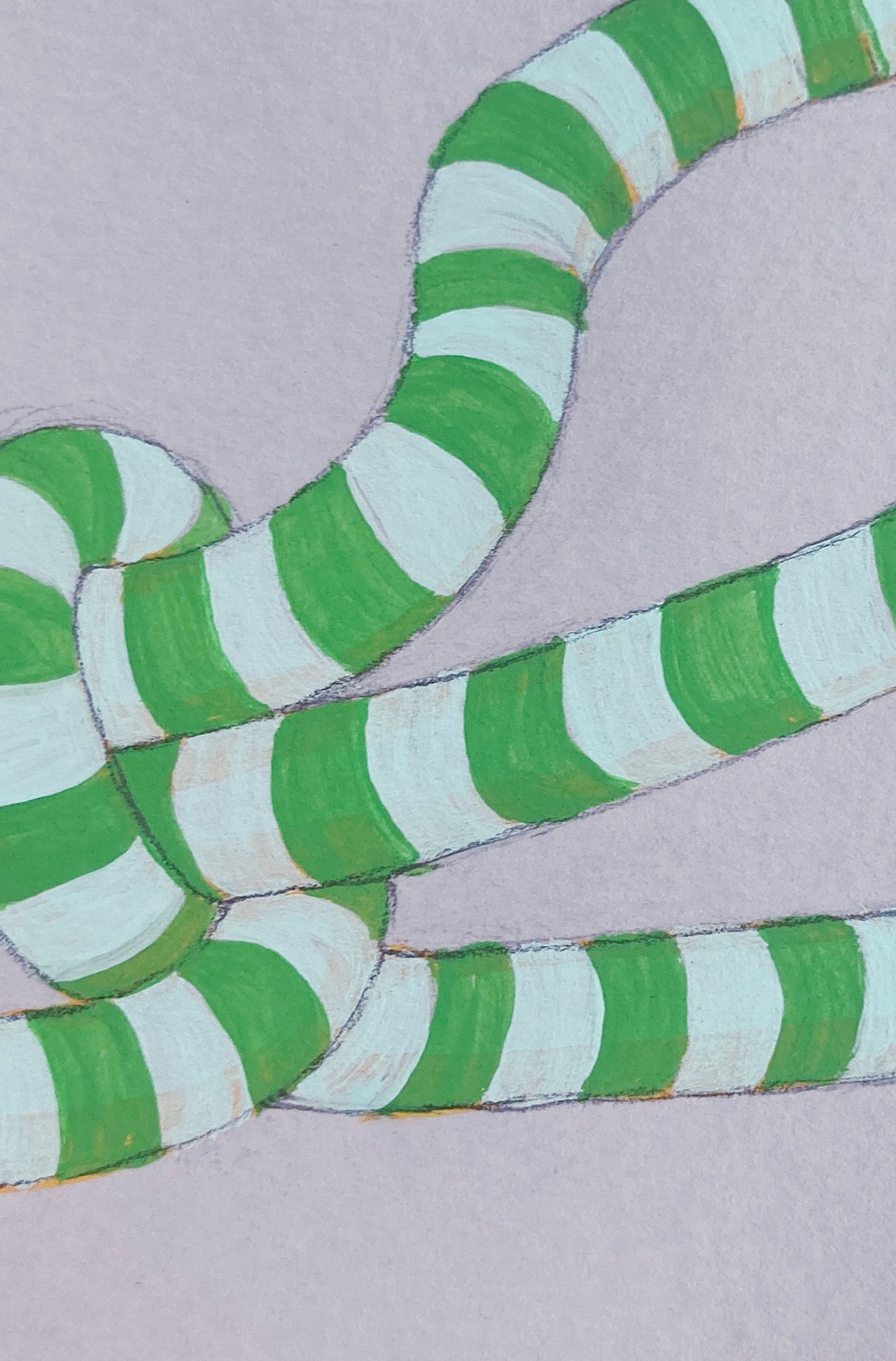 Childhood cartoons, ropes, snakes, knots, worms, stripes, color theory, hipnosis, riverbends, tension, Captain John Smith, Slimey the Inchworm