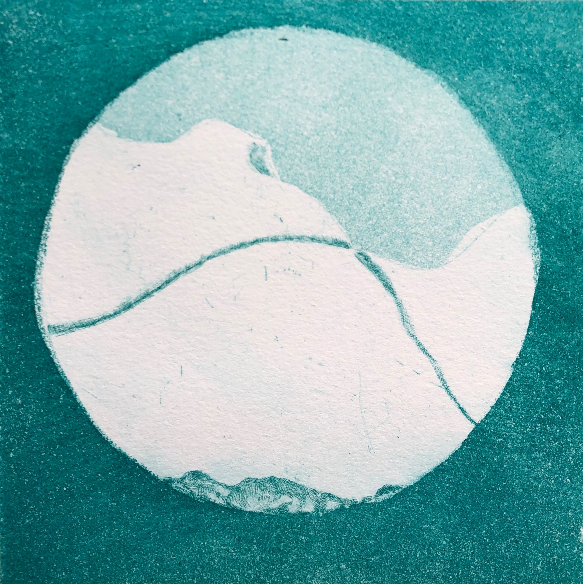 These small 6x6" etchings are a personal response to spending most of my time in Greenland glued to binoculars. These images show close ups of icebergs, recreating my experience of sailing along with binoculars in hand.