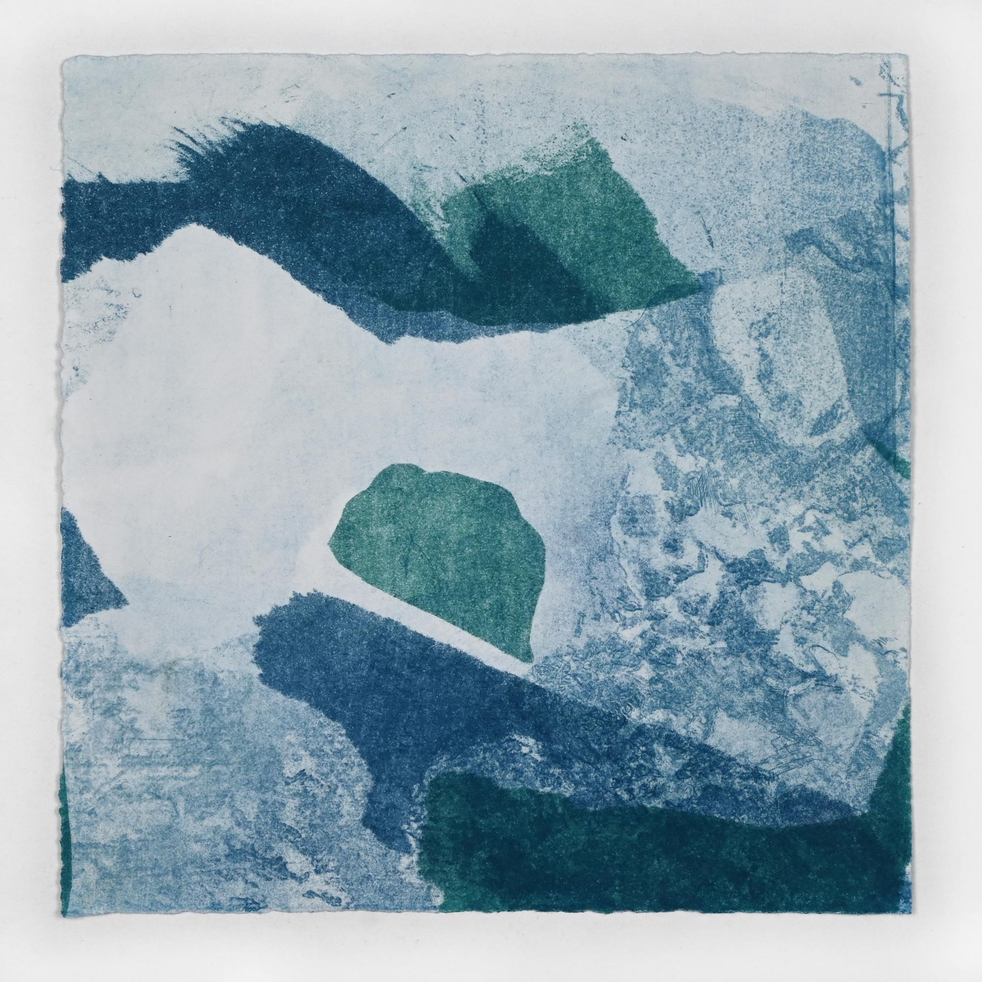 A series of experimental etchings evoking atmospheric Arctic seascapes. These pieces were made in memory of ice watches during the MaréMotrice artist residency in Greenland, sailing through foggy fjords. They function like a brilliant, shapeshifting, reveal through the fog and play with Arctic mirages and cause tricks of the eye. There are moments of clear detail and sublime wonder amidst fragmentation. Two etching plates were printed over each other multiple times in different orientations to create new and abstracted imagery. Stencils made of torn newsprint were used to block ink during the printing process, creating the white shapes throughout the works. The stencils were continually torn apart and reused throughout the series so that the stencil shapes become self-referential but are constantly transforming and deteriorating.