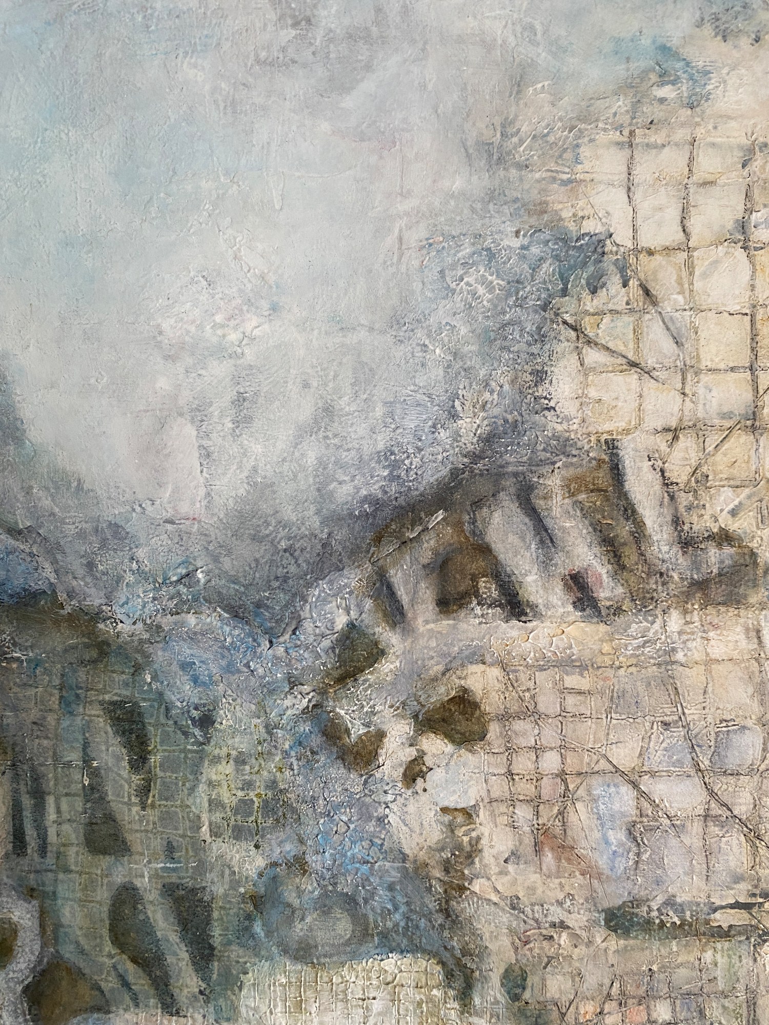 This original acrylic painting with collage and other mediums on gallery wrapped canvas is wired, and ready to hang. The imagery wraps around the sides for seamless viewing.