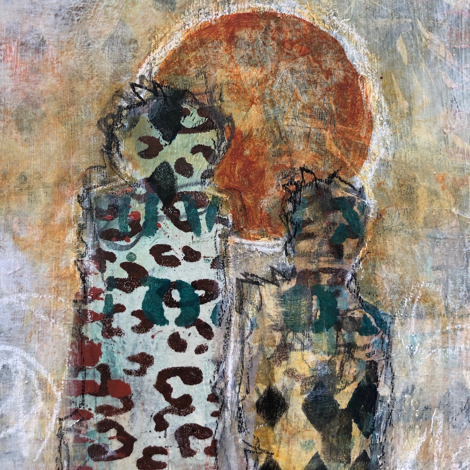 Original painting in acrylic & mixed media on 300 gsm watercolor paper in a white 14x11 mat with 7.5 x 9.5 opening, varnished and ready to frame