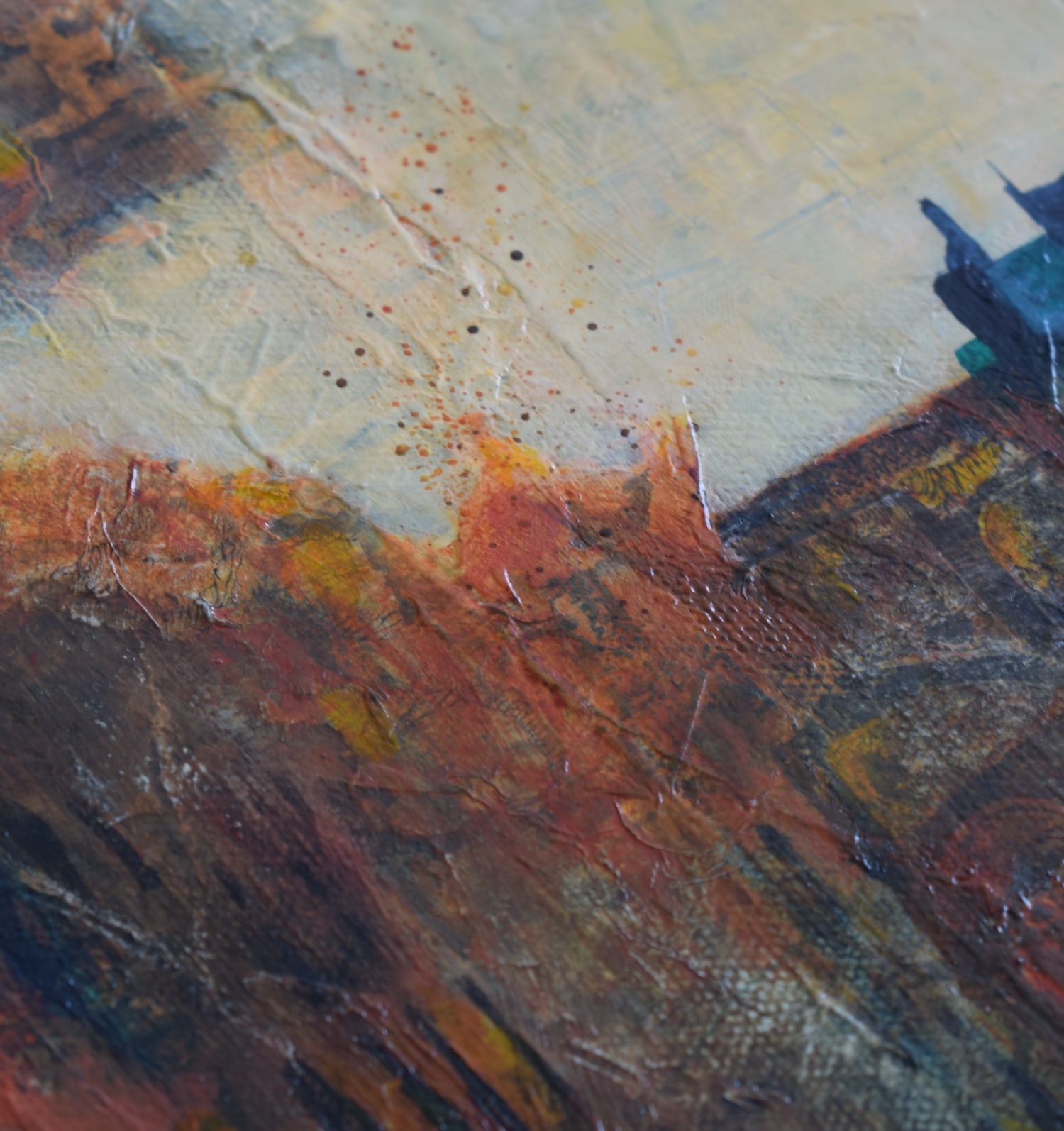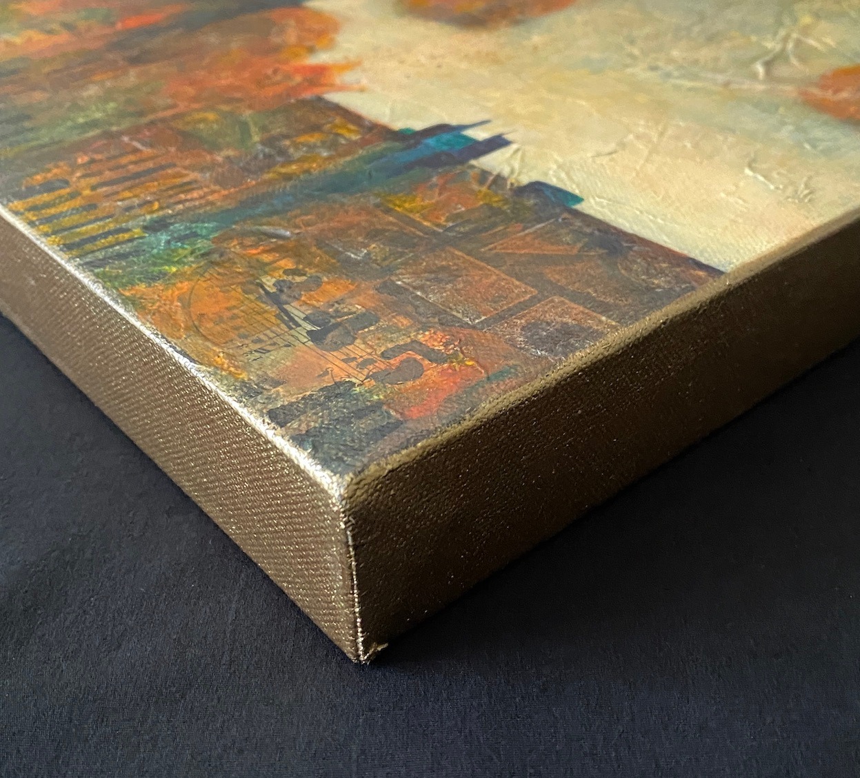 This original acrylic painting on gallery wrapped canvas is wired, ready to hang. The sides are finished with iridescent bronze for a nice presentation.