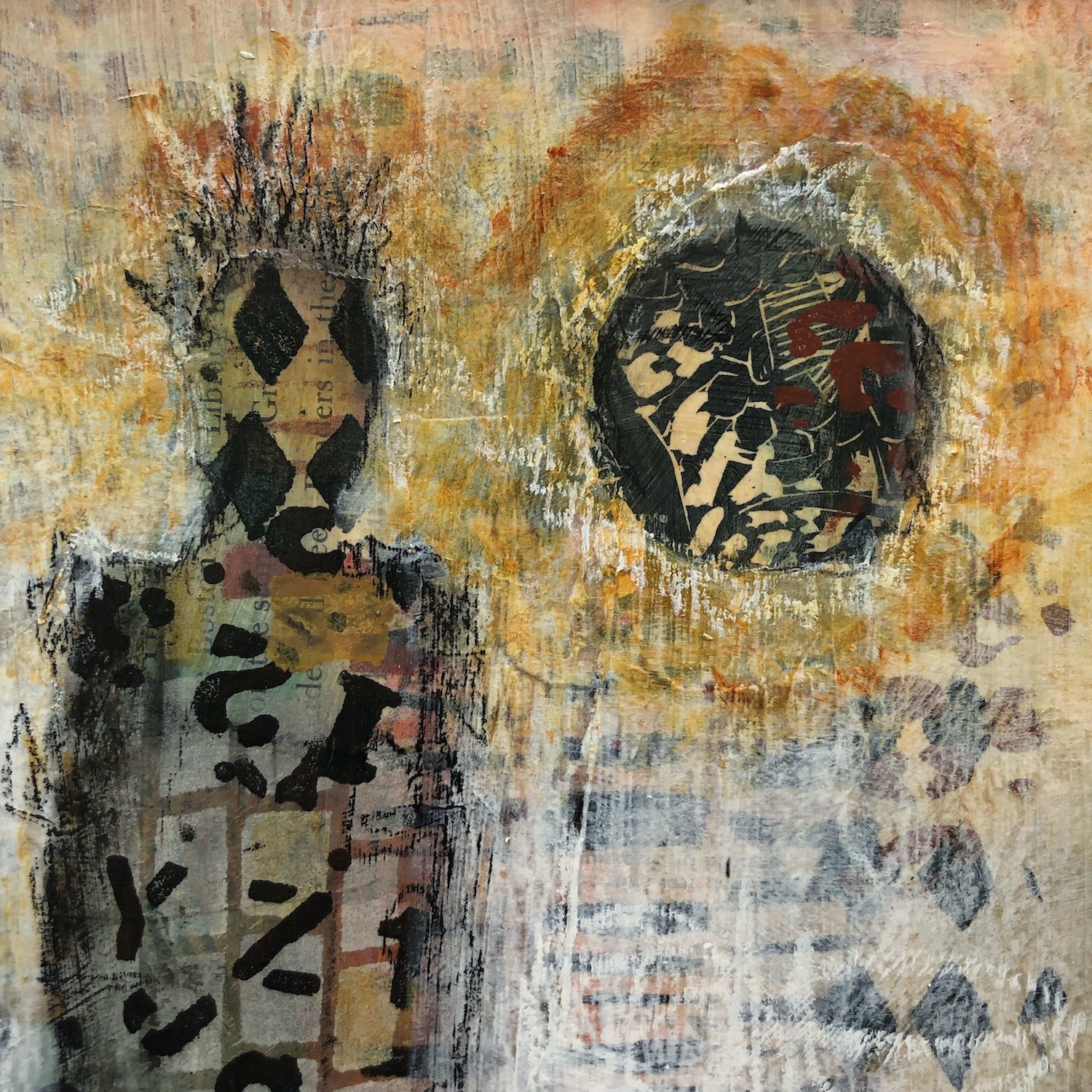 Original painting in acrylic & mixed media on 300 gsm watercolor paper in a white 14x11 mat with 7.5 x 9.5 opening, varnished and ready to frame