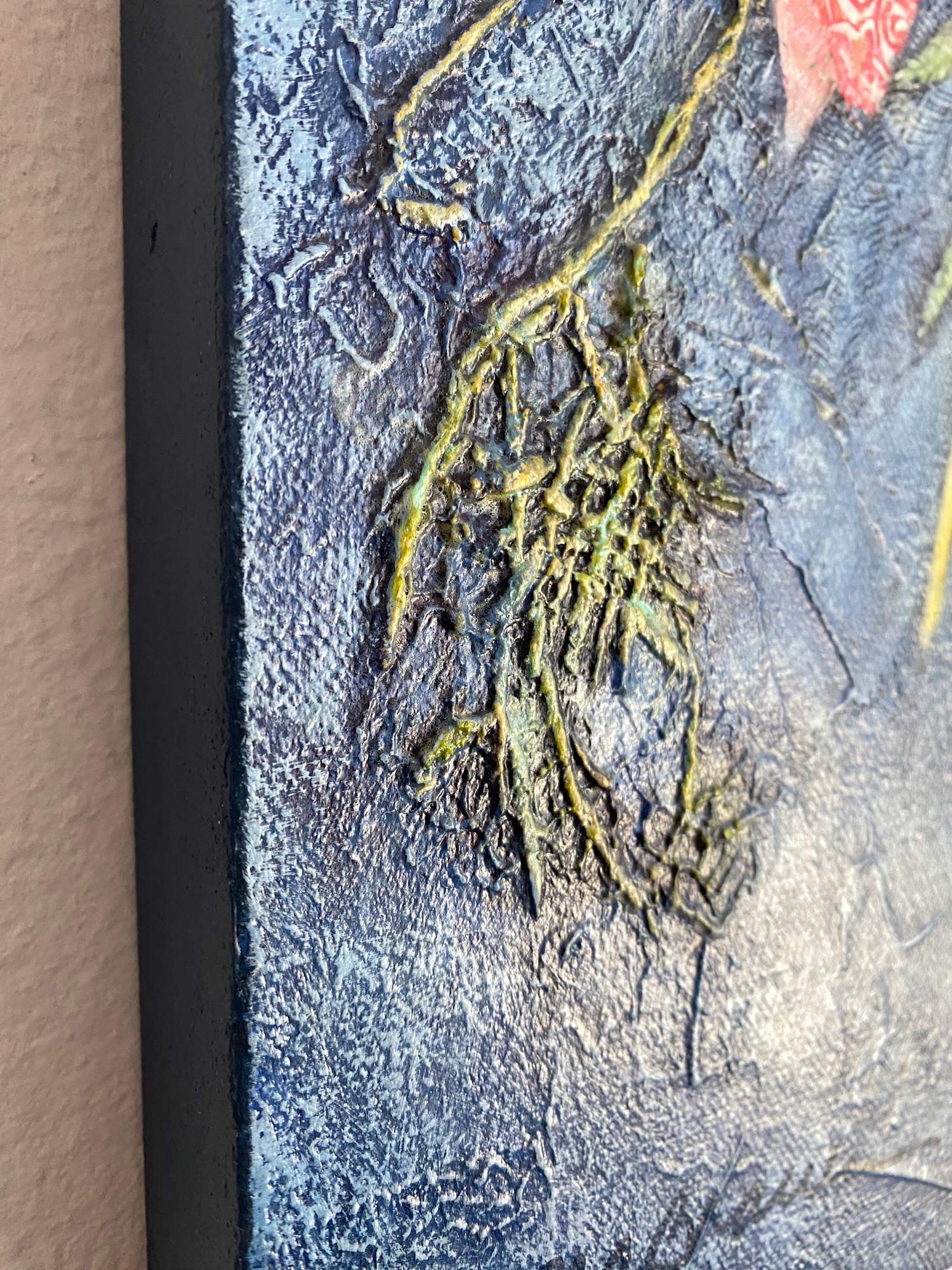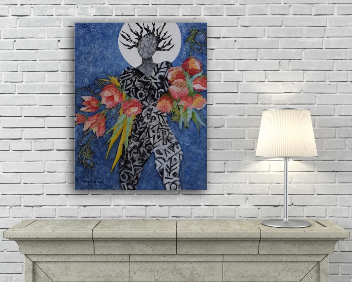 Created on gallery wrapped canvas, sides in blue, wired & ready to hang