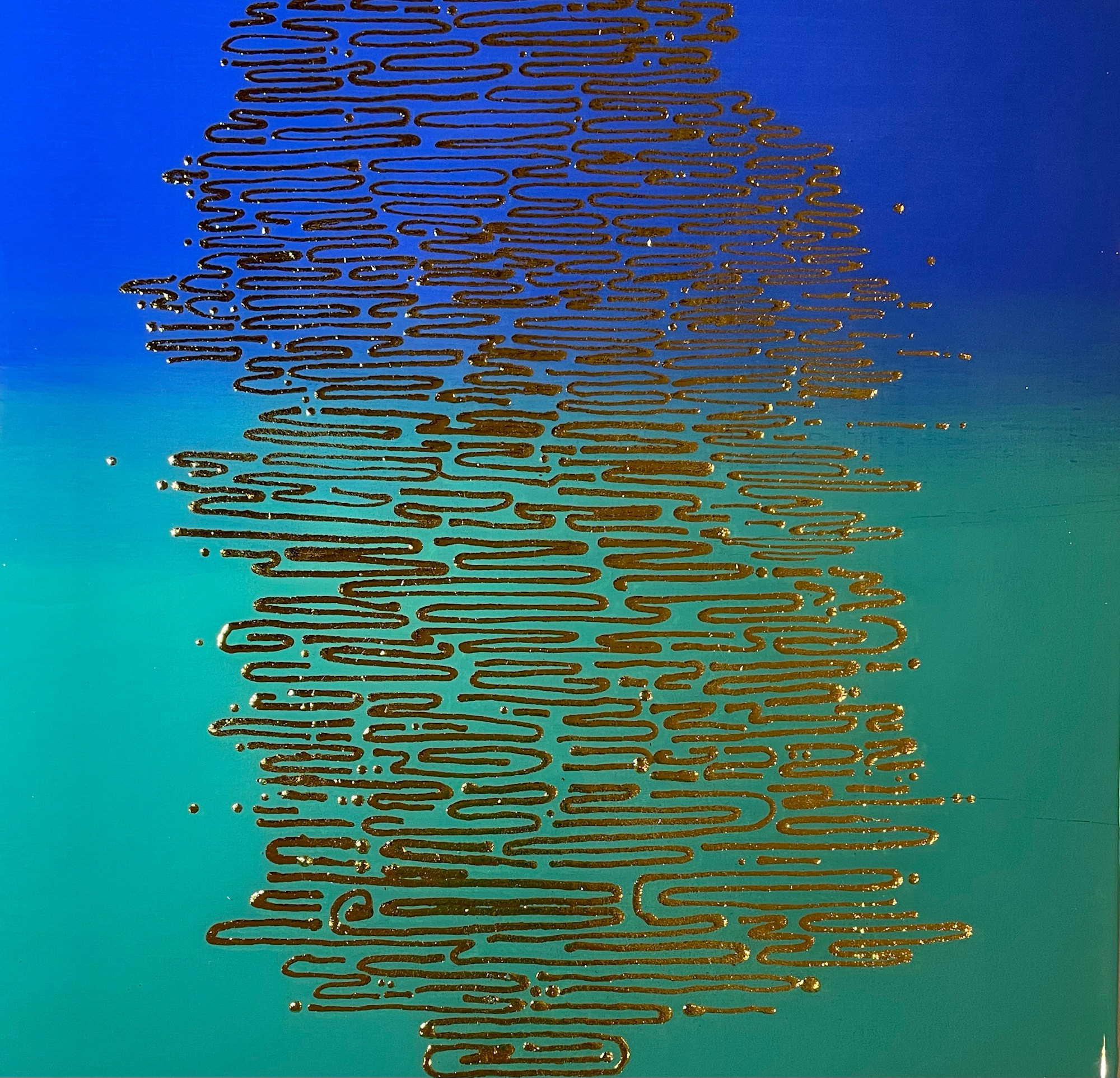 Acrylic, metal leaf, resin on cradled panel