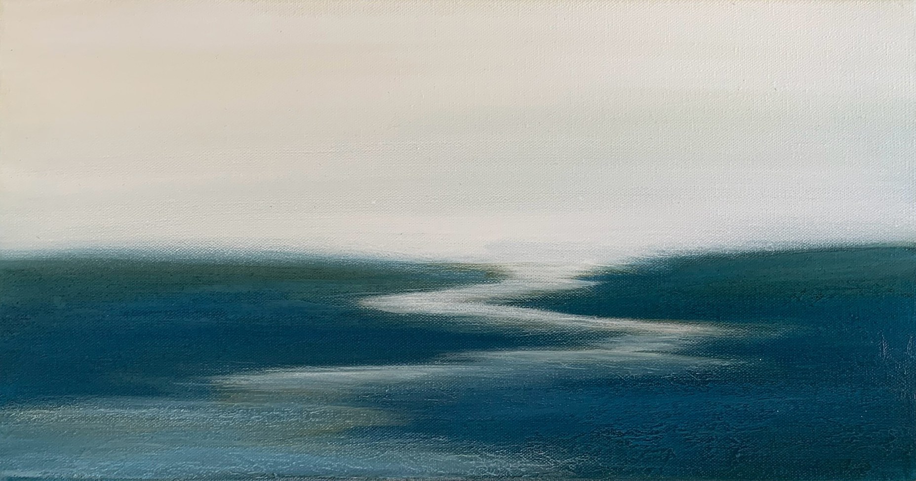 Coastal artist working thin fluid paint layers or buttery cold wax. Building layers to create complex visual texture resulting in works peaceful in nature.