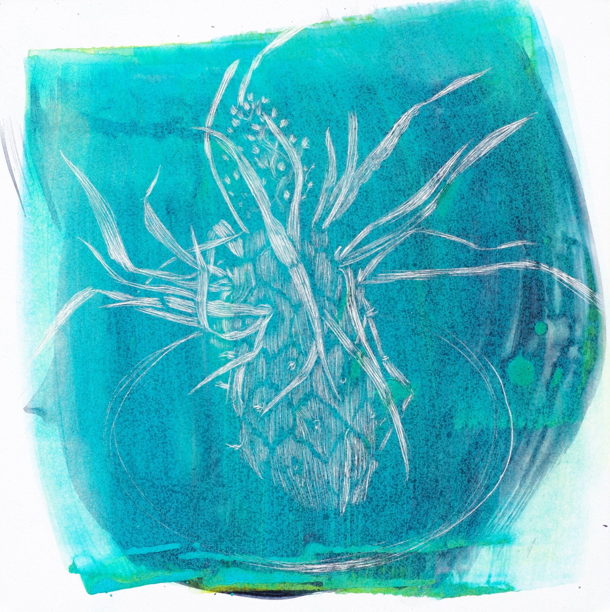 incised lines in watercolor on panel