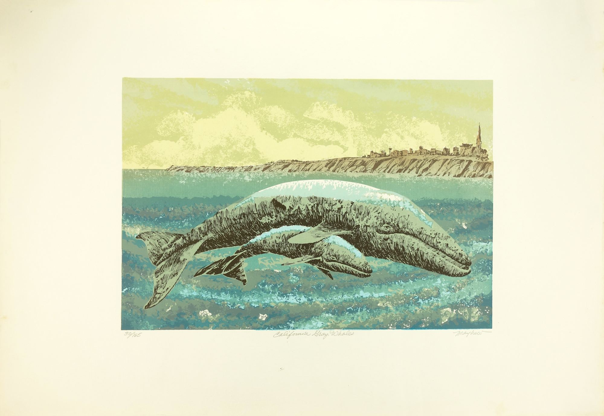 This is an original, signed, and numbered serigraph by J.D. Mayhew. A total of 9 prints from this series were generously donated to the Mendocino Art Center by John Bear in late 2020. This print was created in 1976 or '77 as a fundraiser for the Mendocino Whale War. J.D. Mayhew created the original artwork and Byrd Baker did the actual silk screening. These print have not previously been privately owned.