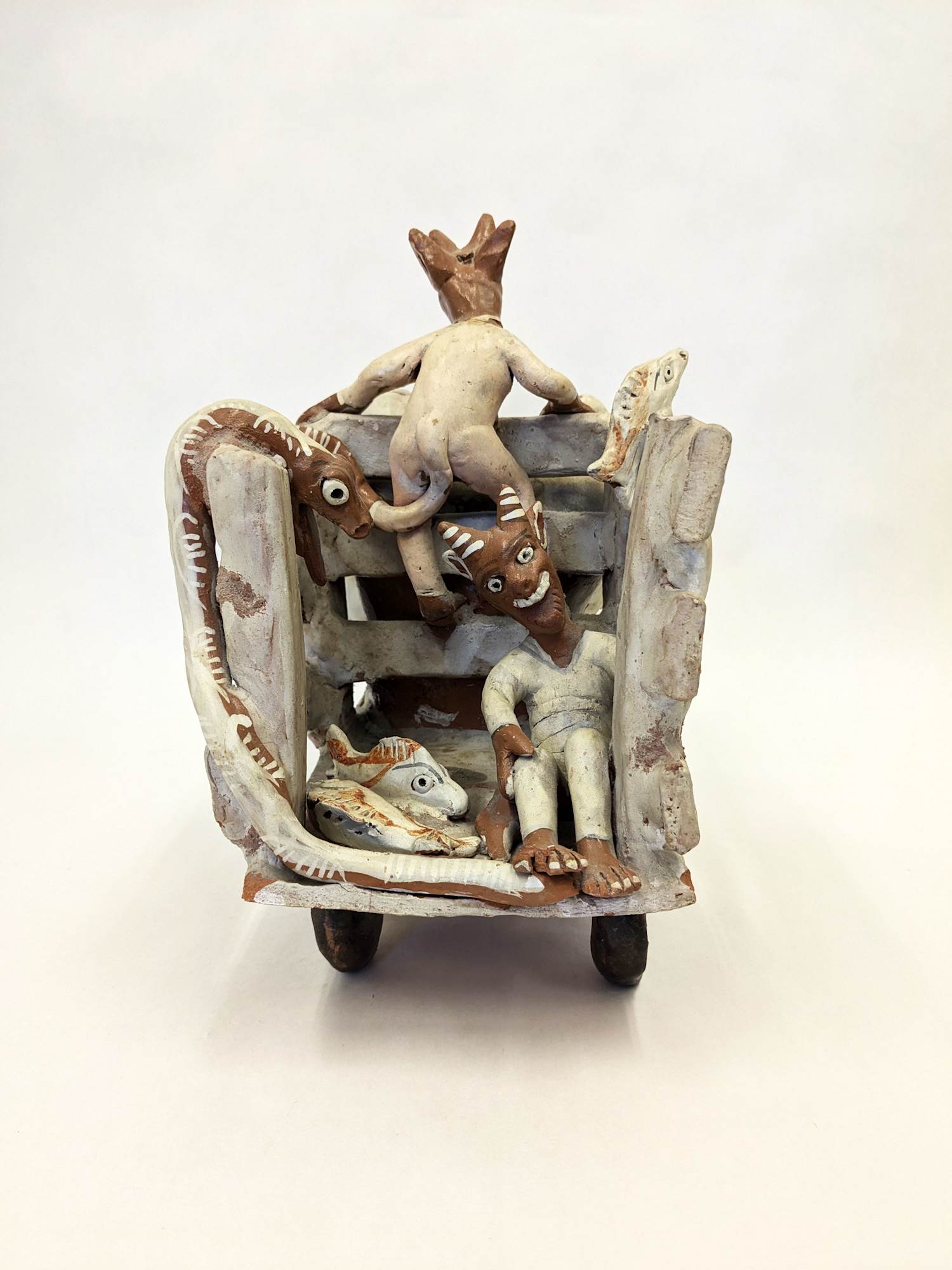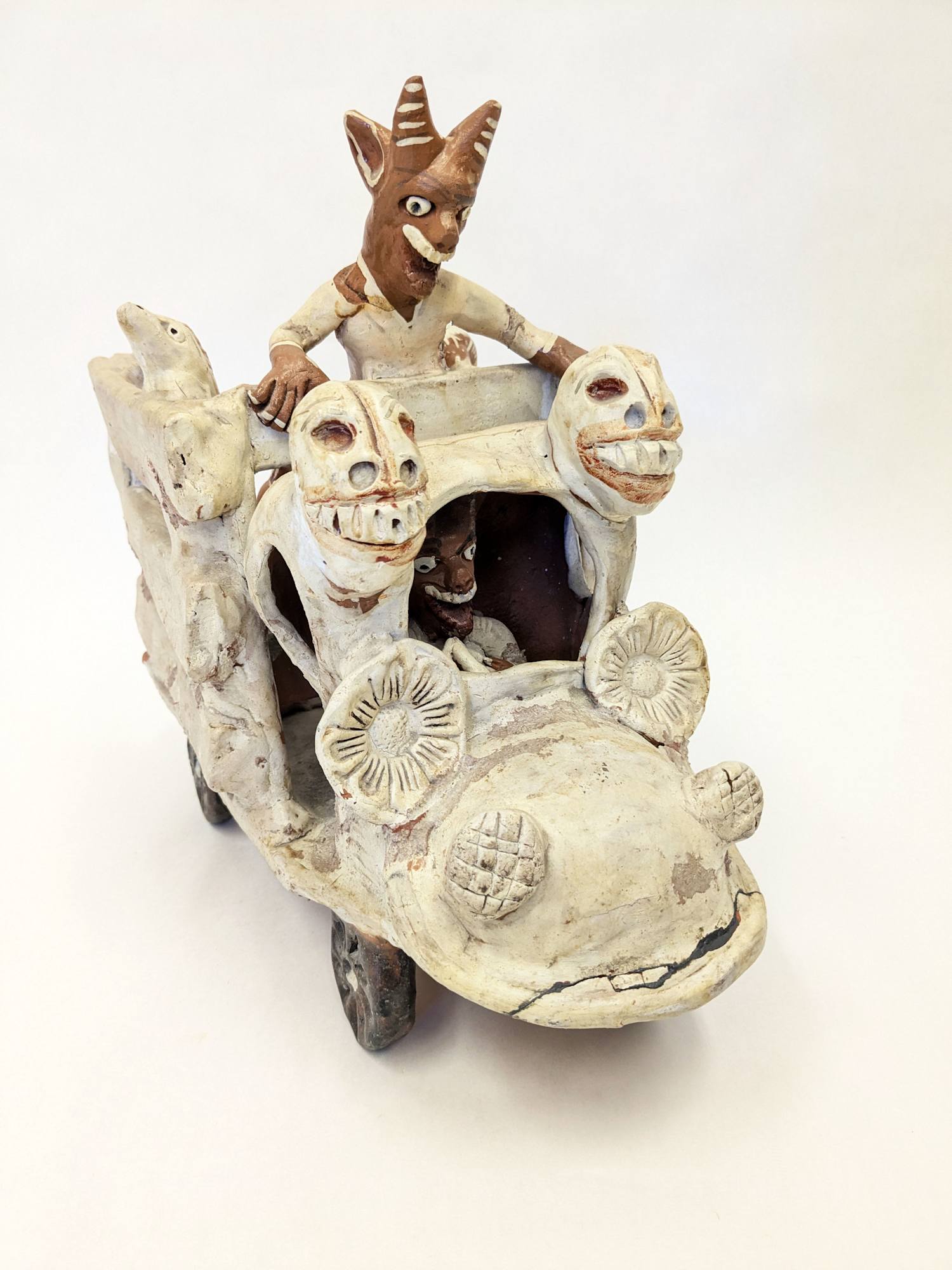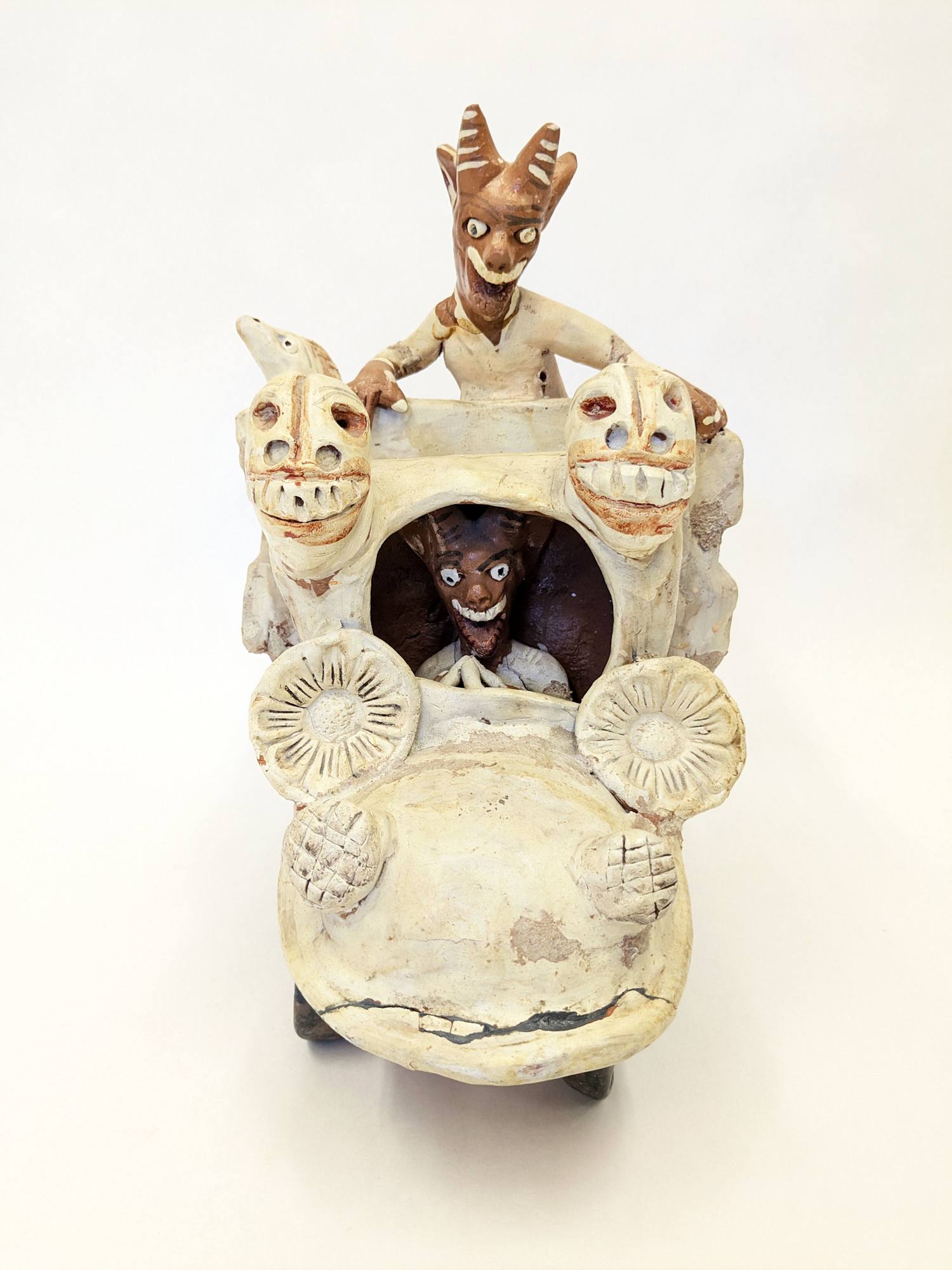 Ceramic sculpture with two devils riding in the back of a truck with other devil driving.