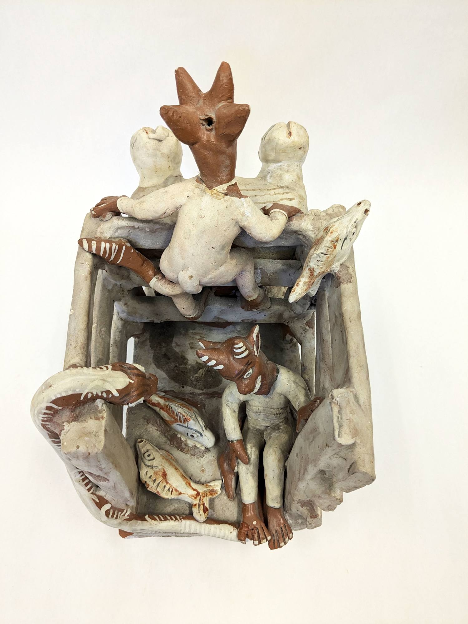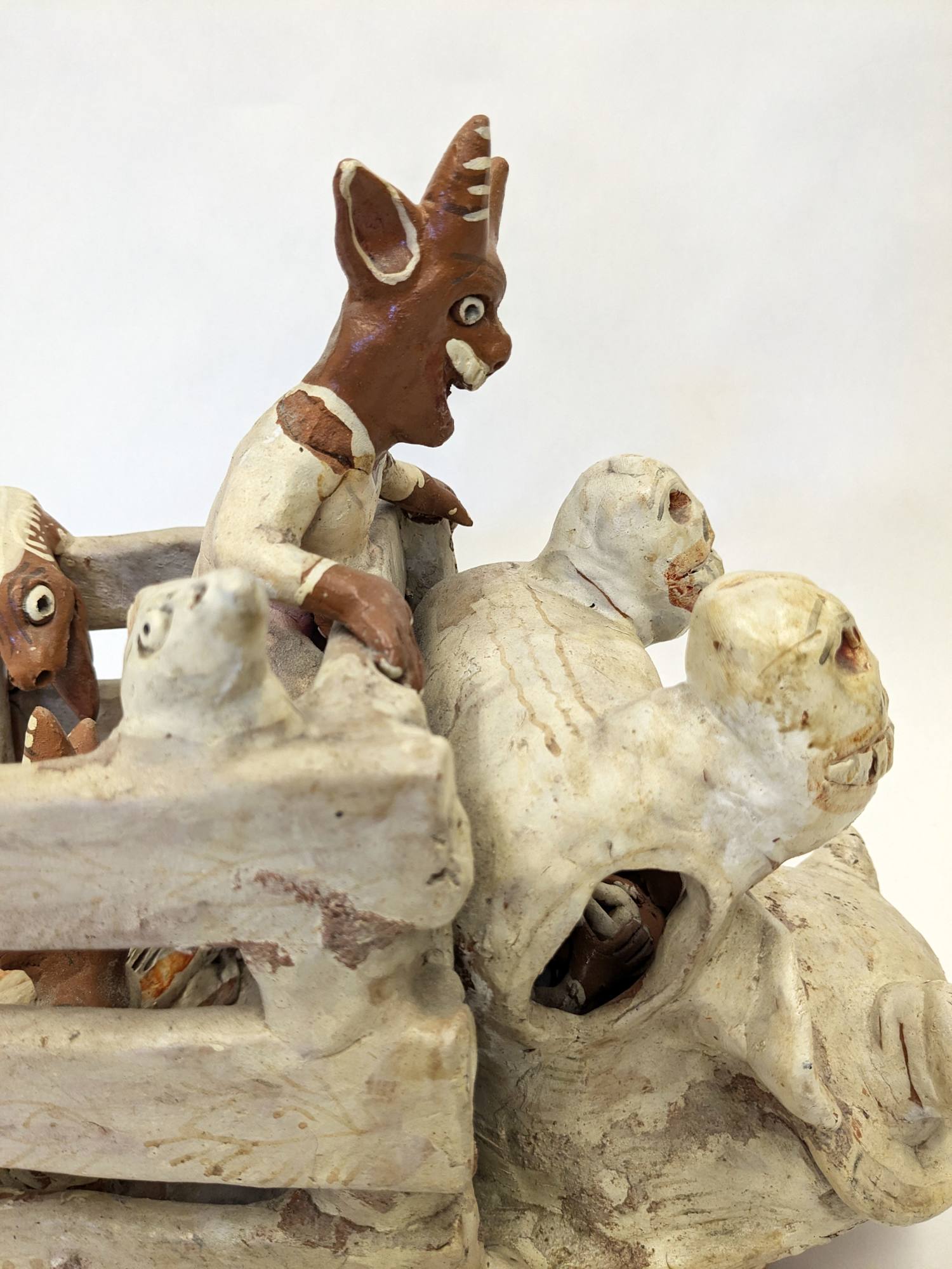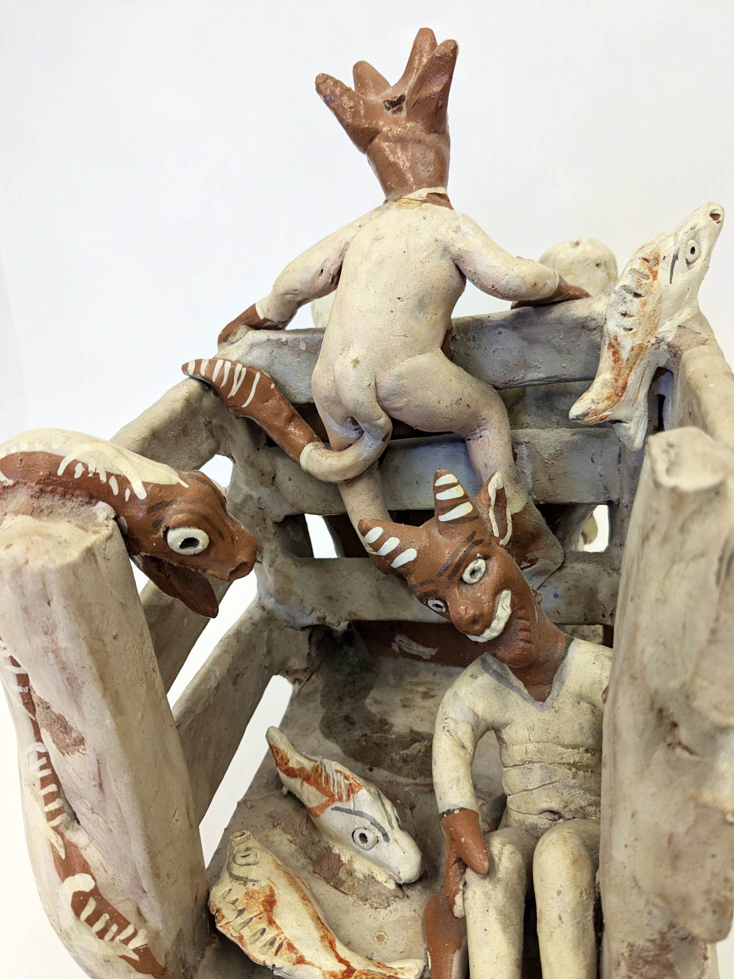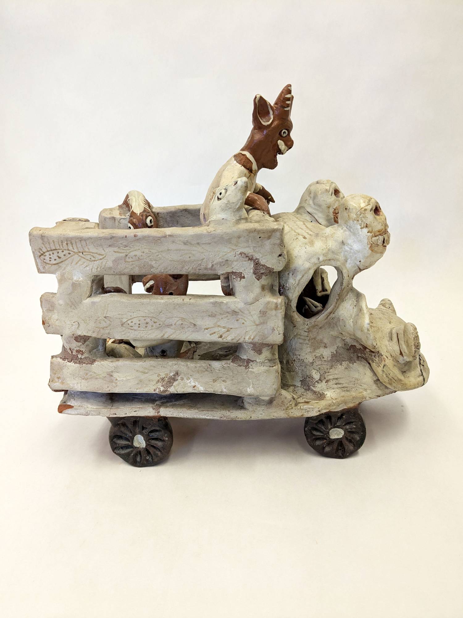 Ceramic sculpture with two devils riding in the back of a truck with other devil driving.