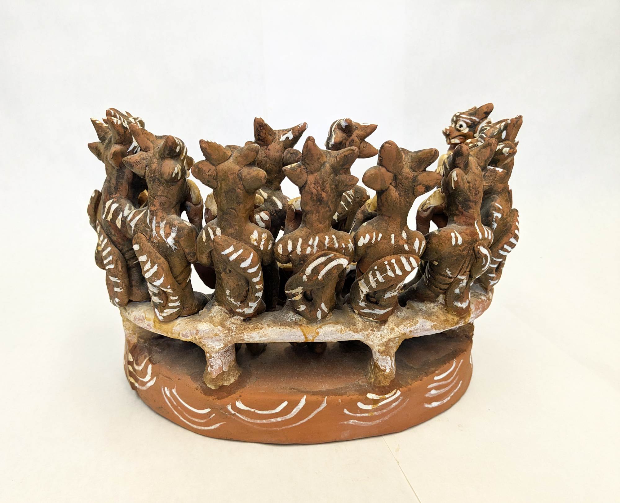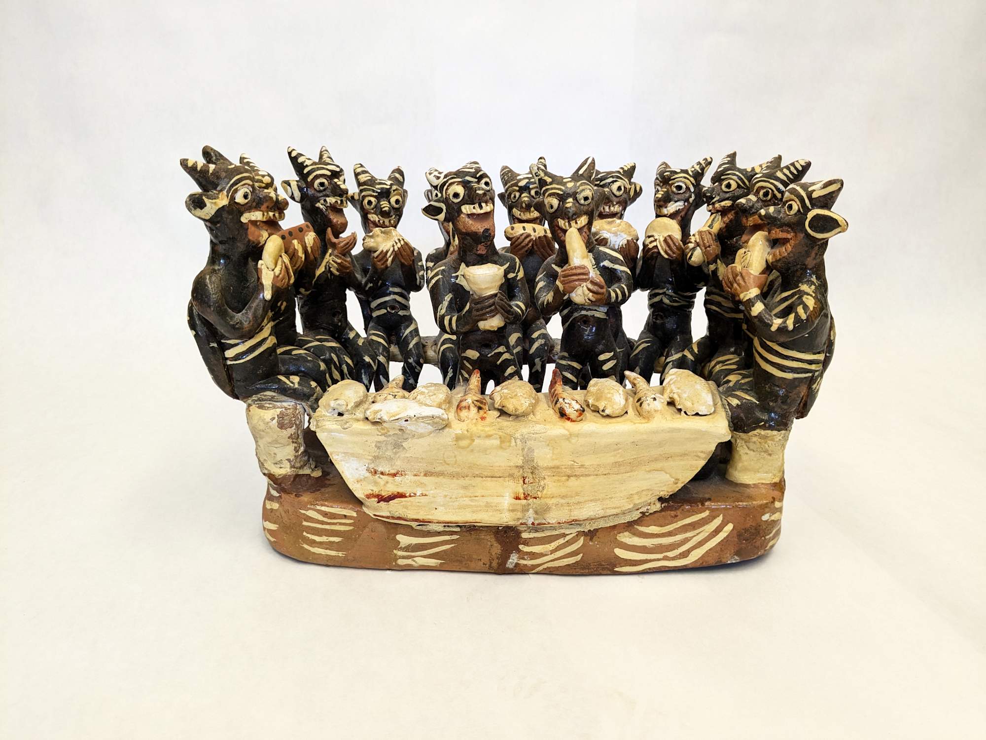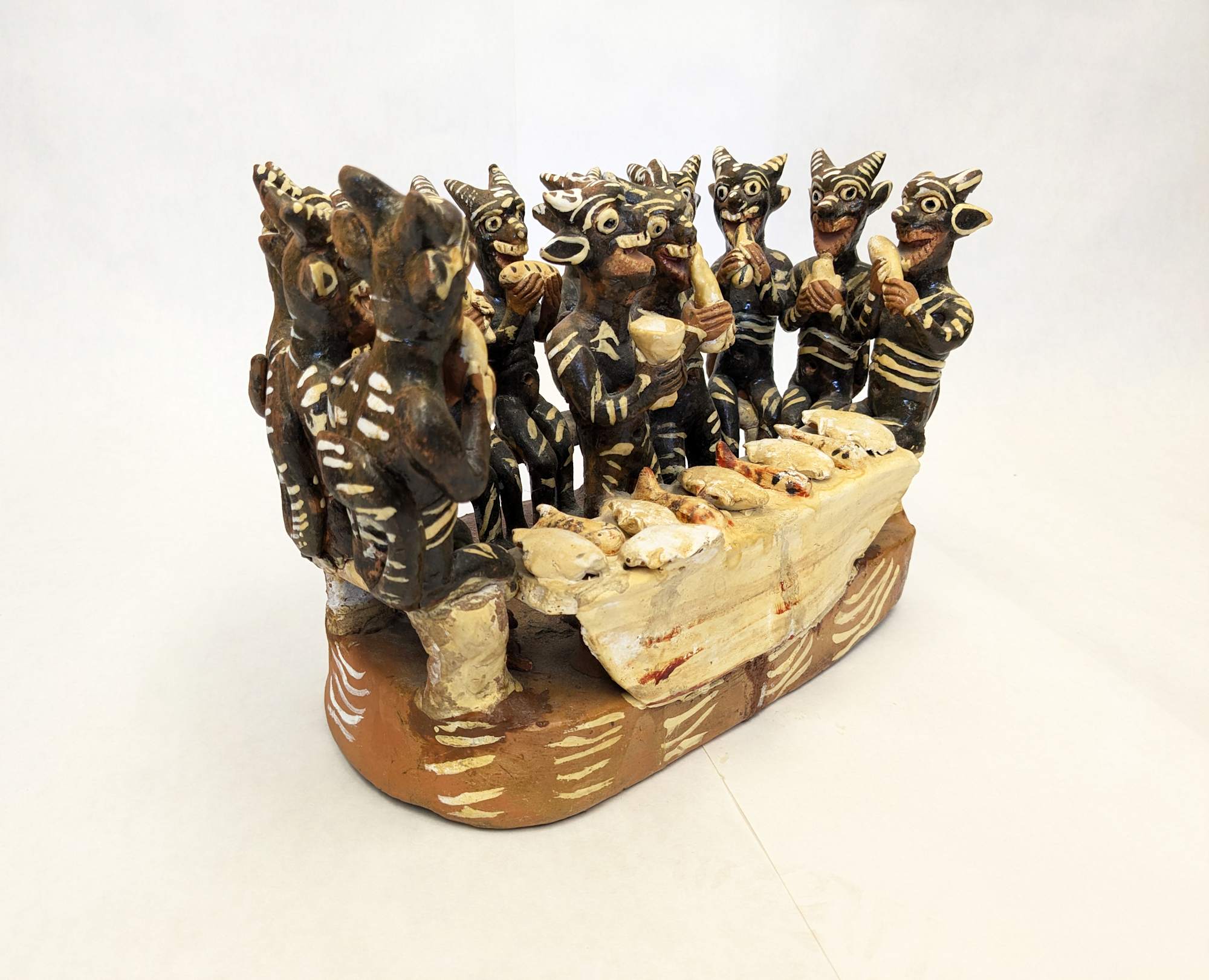 Ceramic sculpture of multiple devils enjoying a last supper. This work appears to be of Mexican origin.