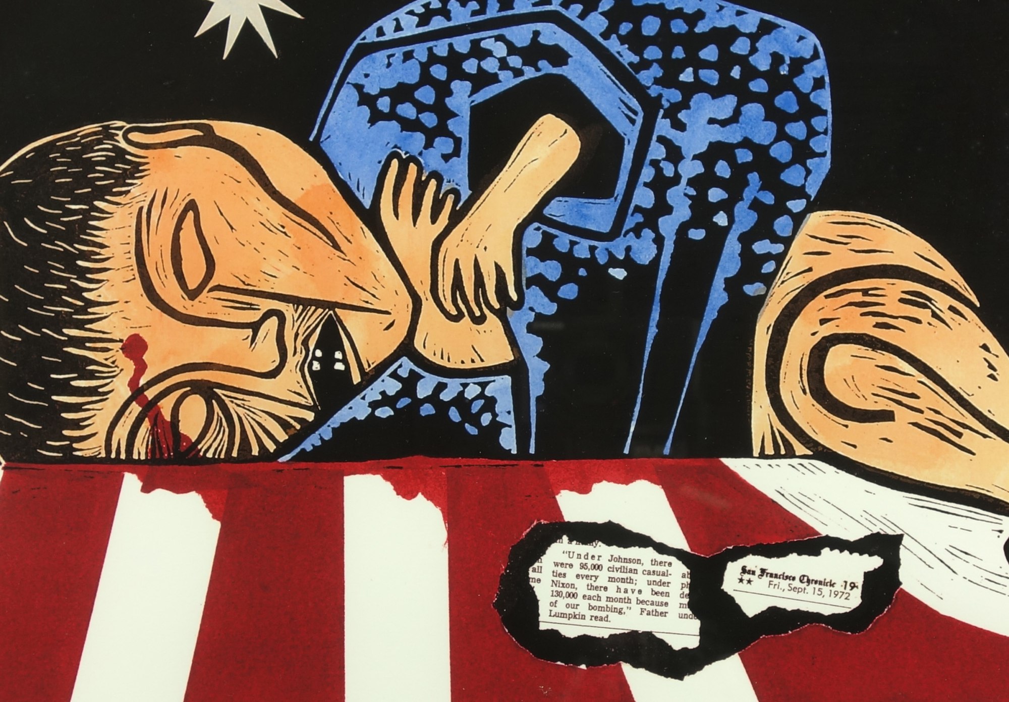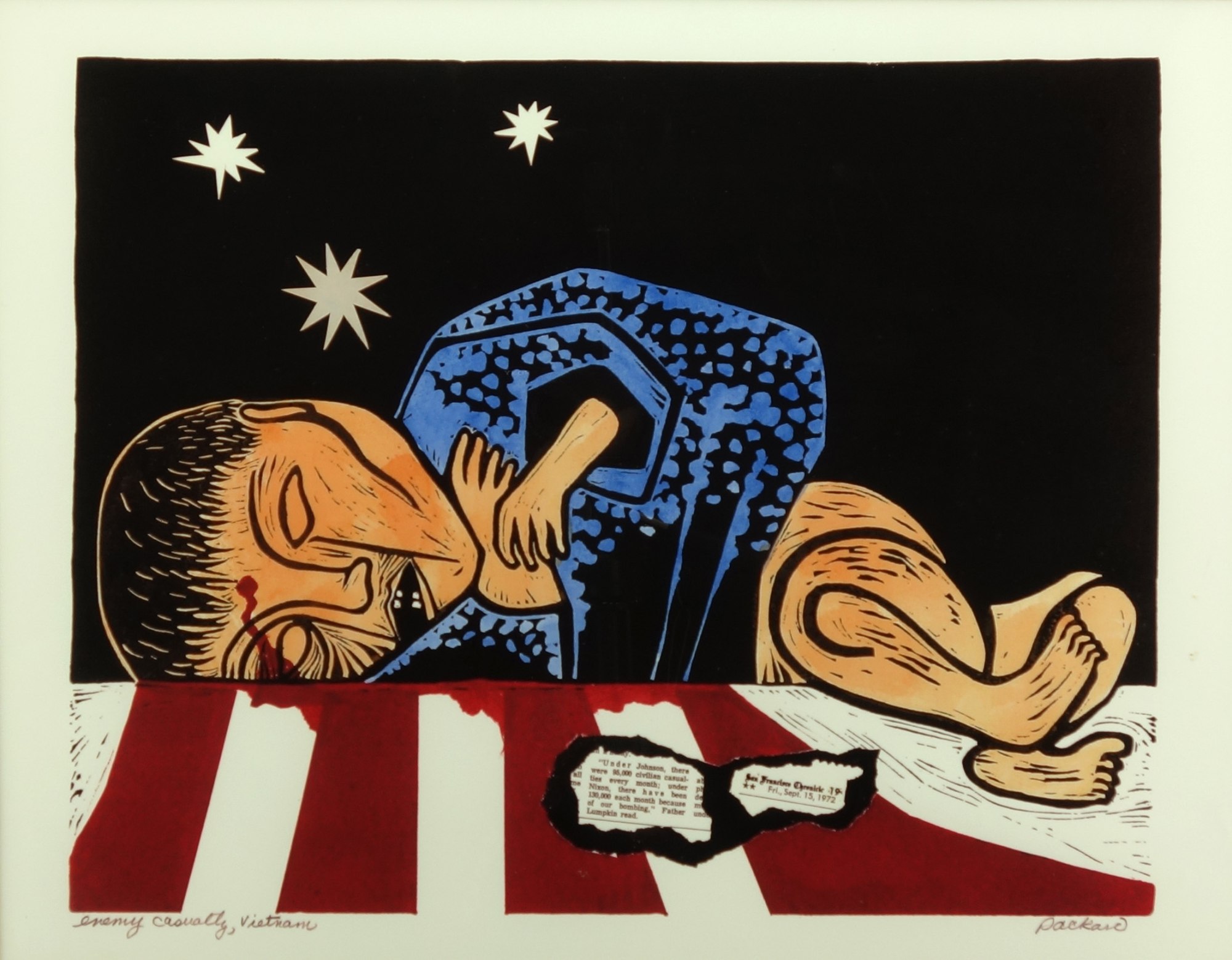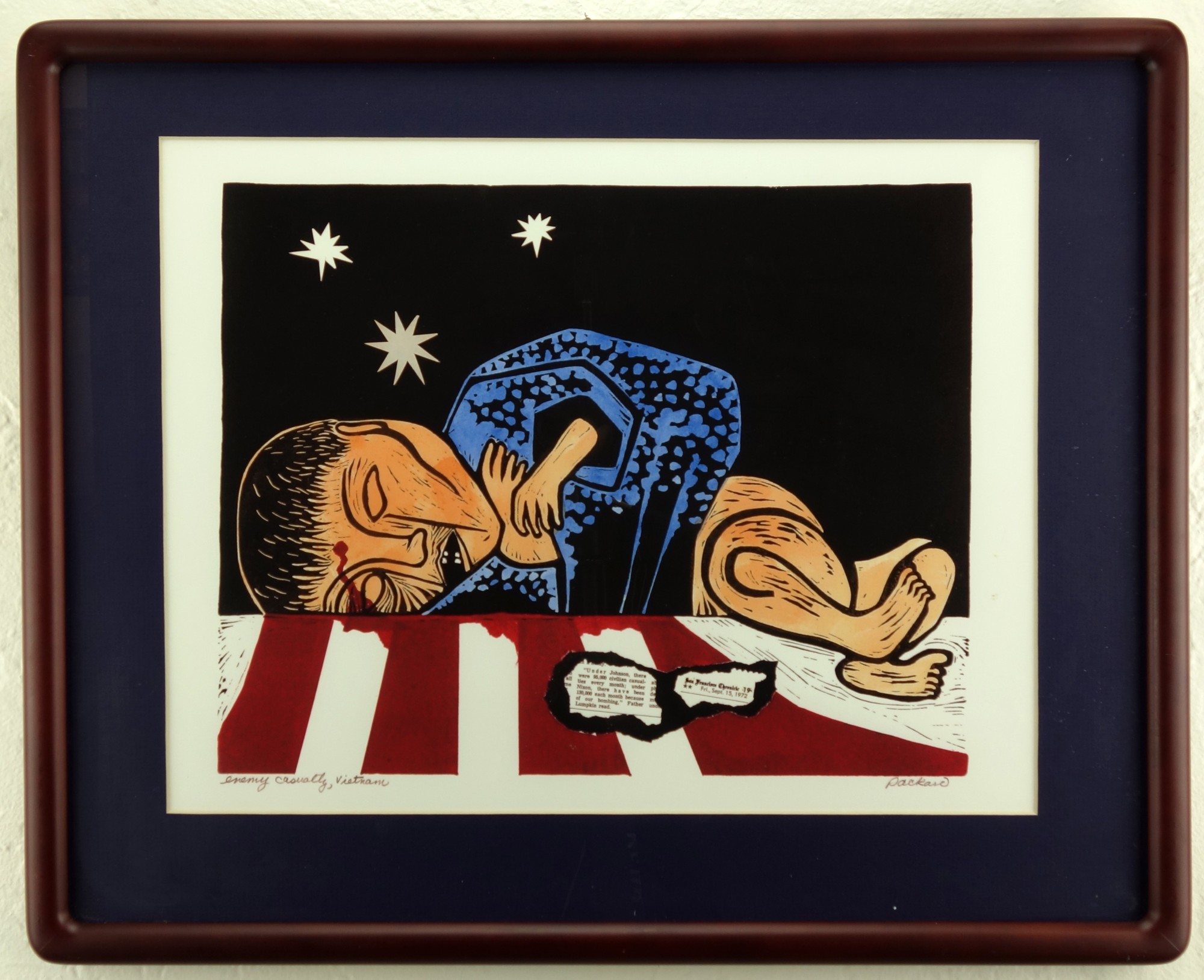 This is a giclée reproduction of Emmy Lou Packard's "Enemy Casualty" block print. This framed giclée came into our possession through a generous donation by Don Cairns and the Packard family estate. This piece most likely was previously owned by either Emmy Lou Packard, or her son Don Cairns.