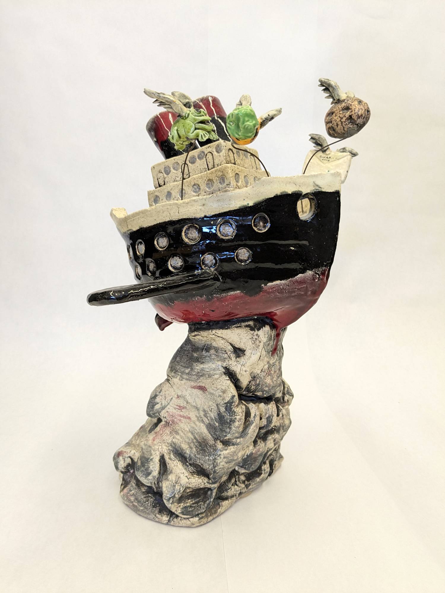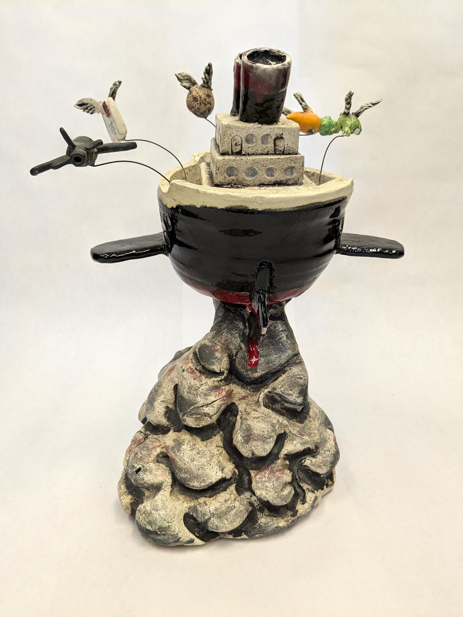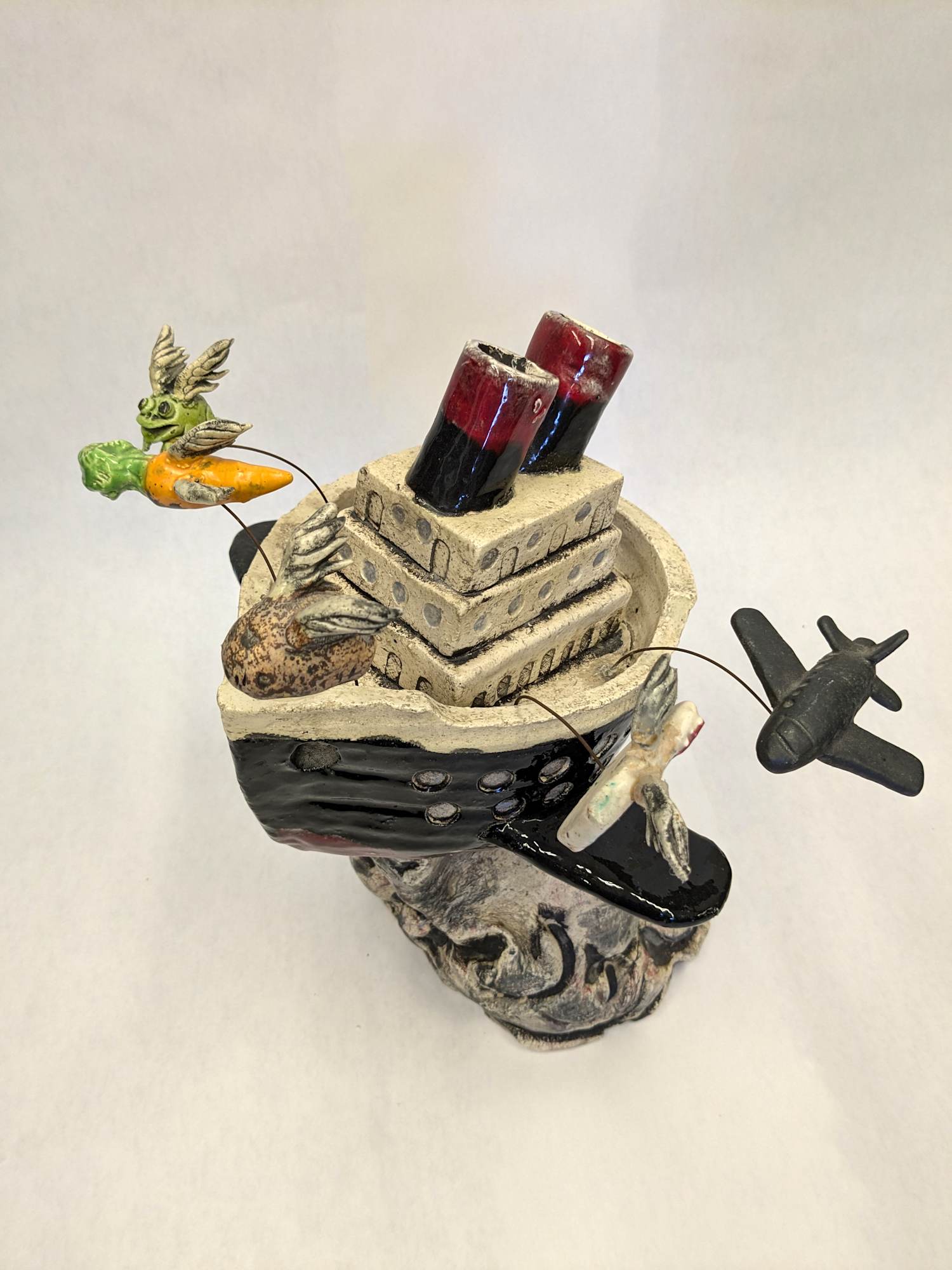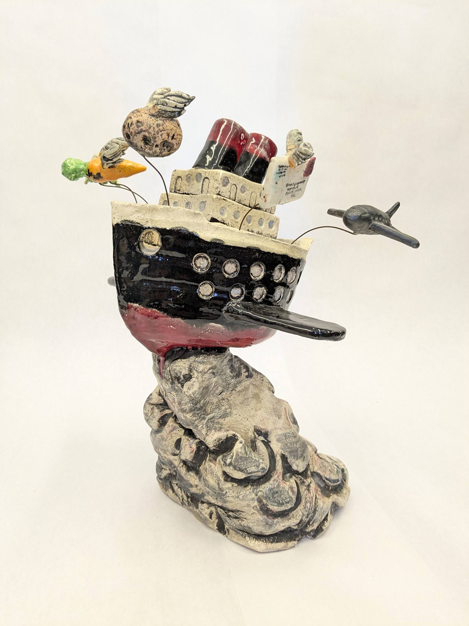 Ceramic ocean liner with wings and wires emanating with flying frog, sea creature, letter, and potato on grey rippled ceramic wave.