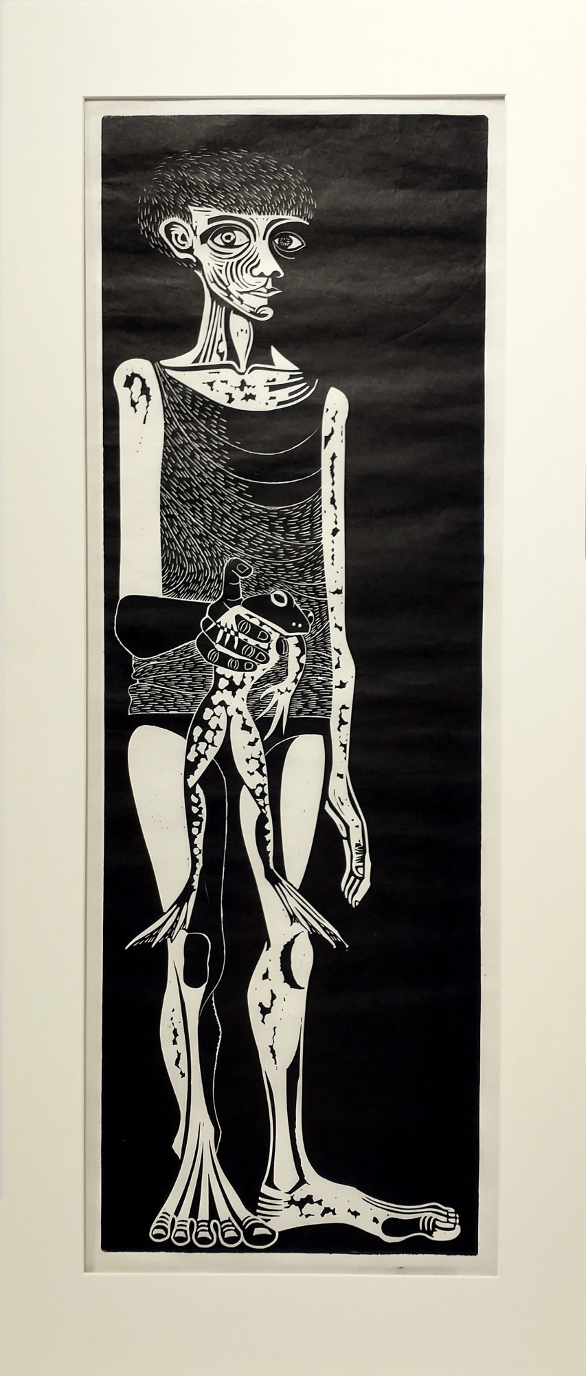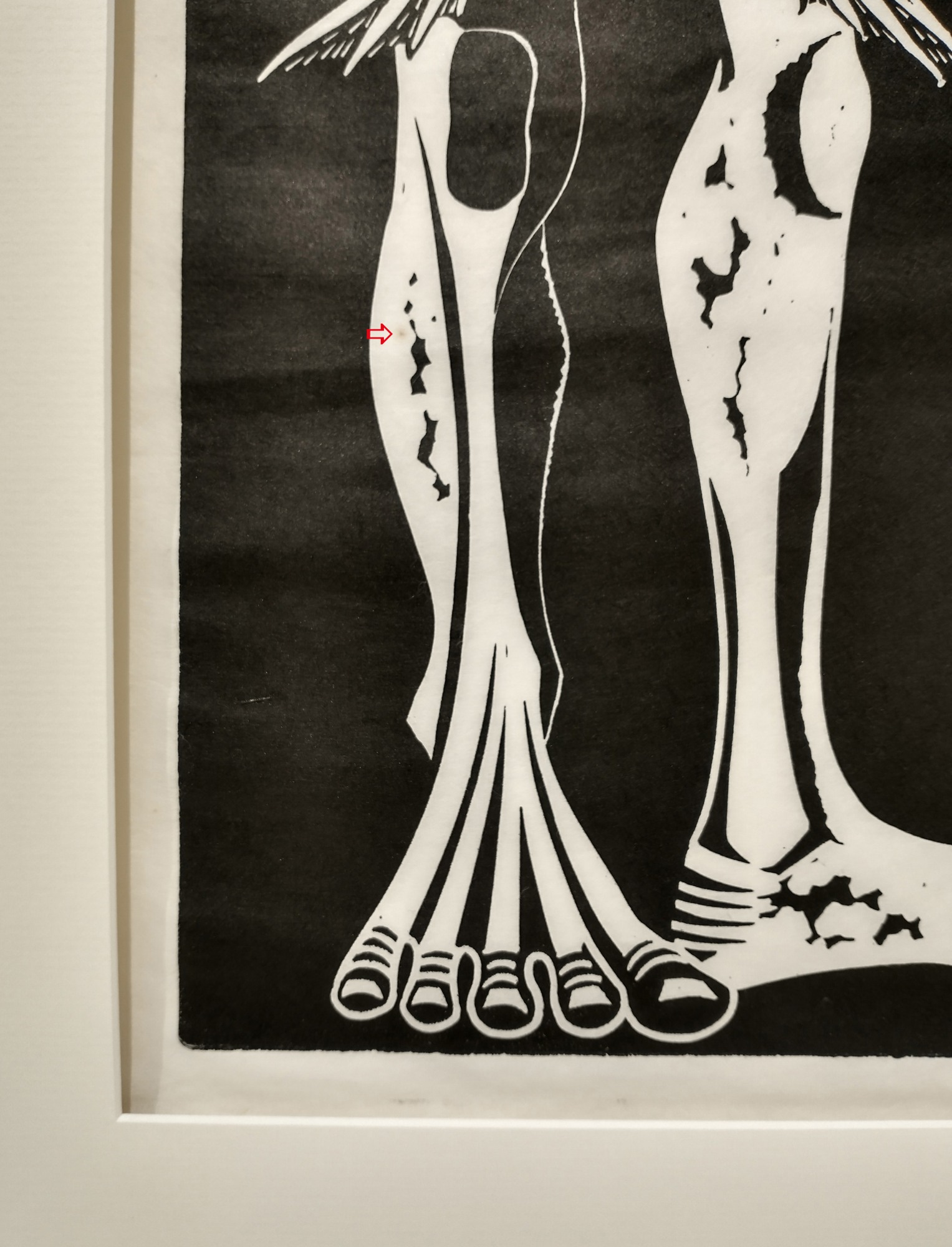 This is an unsigned original block print by Emmy Lou Packard or her estate. This print has a small spot of foxing on it so please look closely at the image to understand any small flaws that may be contained. This small spot is marked with a red arrow in the detailed view. This print was made available through a generous donation of the Packard family estate. This print has been matted and sleeved.