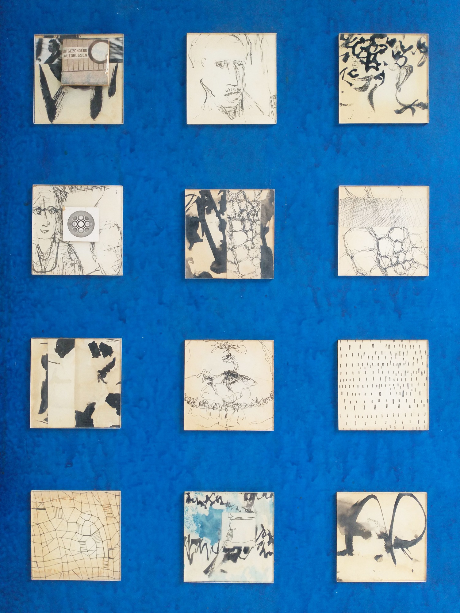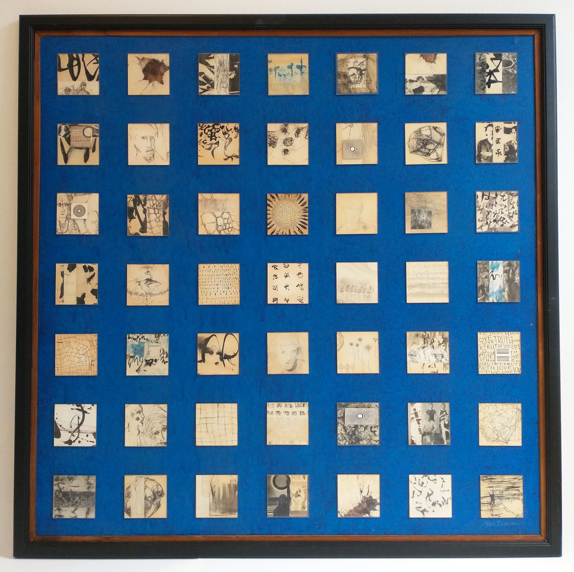 - drawings on paper behind plexi-glass squares on painted pressed board