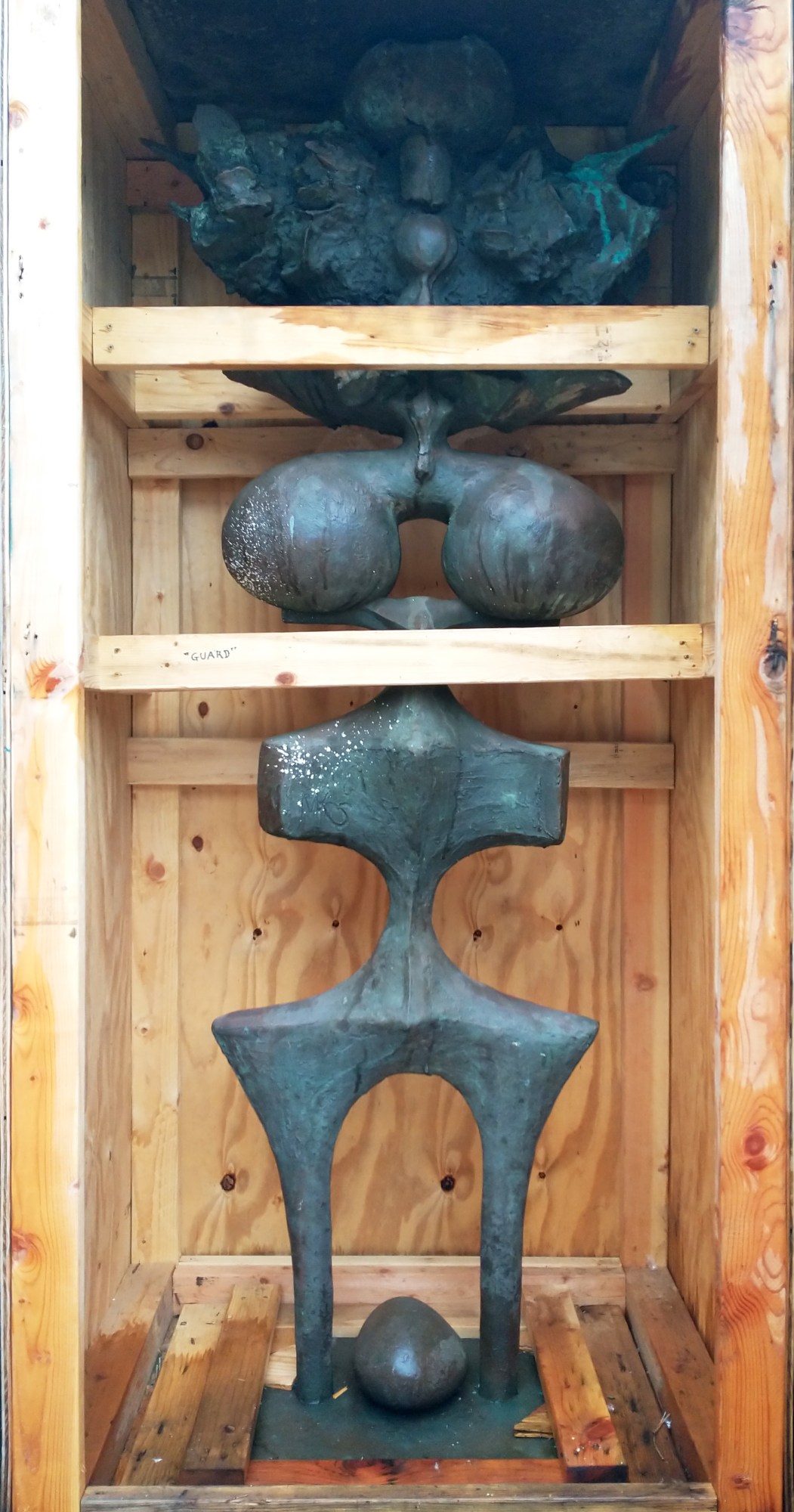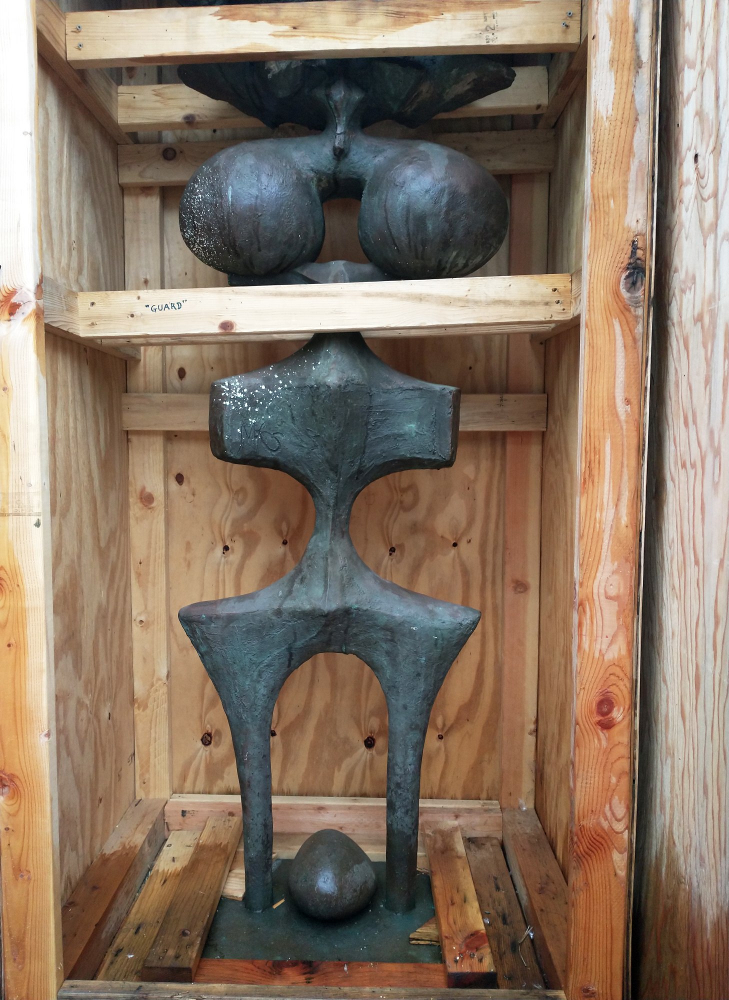 The mold for this bronze sculpture was pulled off of "Surface Person", a concrete sculpture that was also gifted to the MAC. This bronze sculpture by Maxine Kim Stussy came to the Mendocino Art Center through a generous donation by the Maxine Kim Frankel Estate. This sculpture stayed in the private collection of the artist until the time of her death.