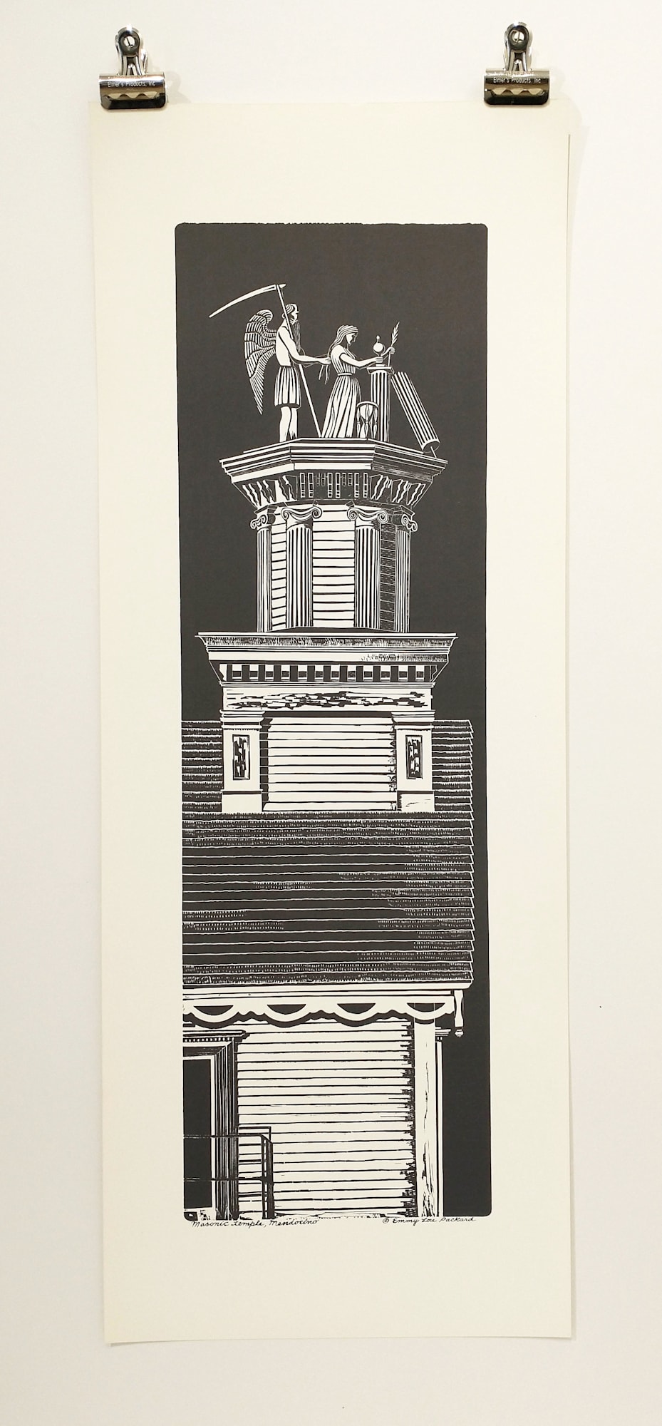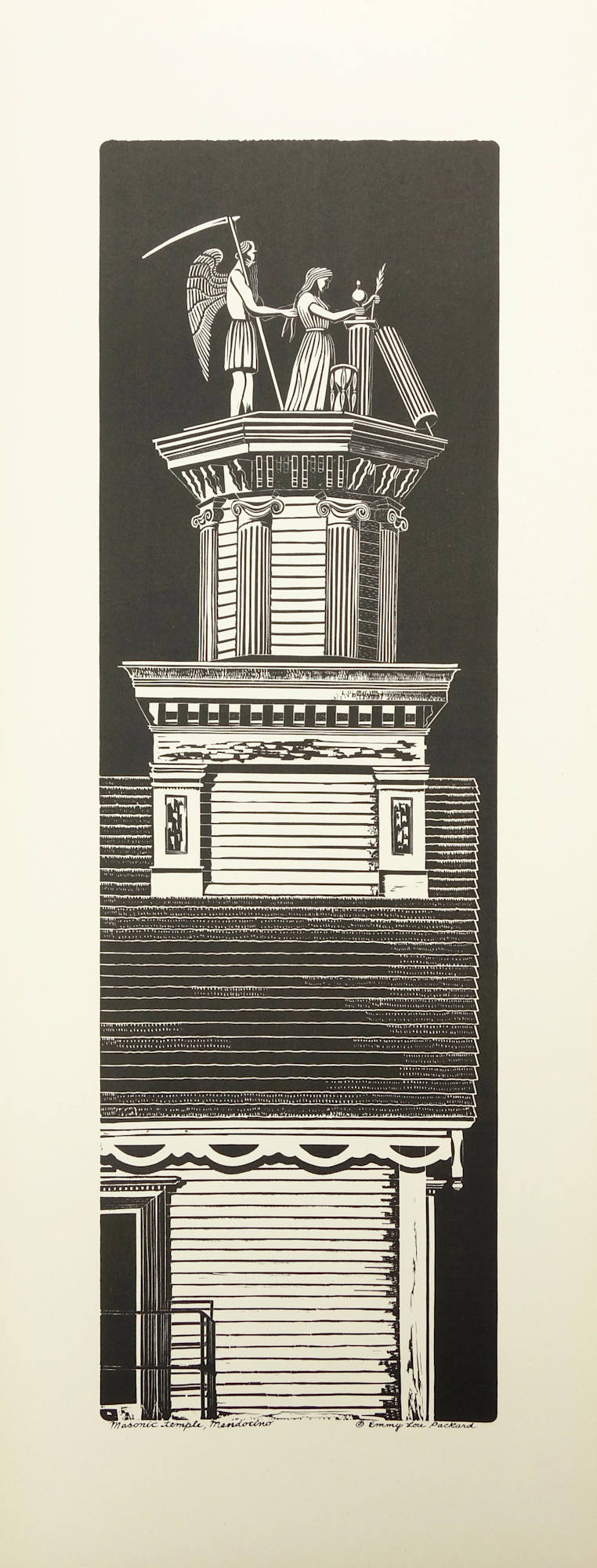 This is a un-matted vintage reproduction of "Masonic Hall". While we are not certain of the process used to replicate this print, we are referring to this class of work as being a "Vintage Reproduction". This is not an original handmade print, but a copy of the original print and was produced for the artist Emmy Lou Packard herself. This print was made available through a generous donation of the Packard family estate. This is a un-framed and un-matted vintage print.
