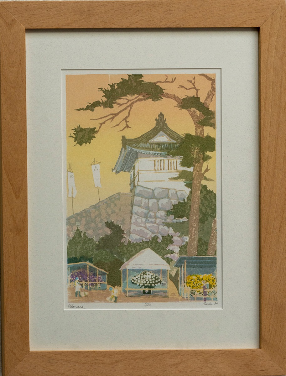 - Subject Matter: Japanese scene of stone and wood architecute, tents and tree