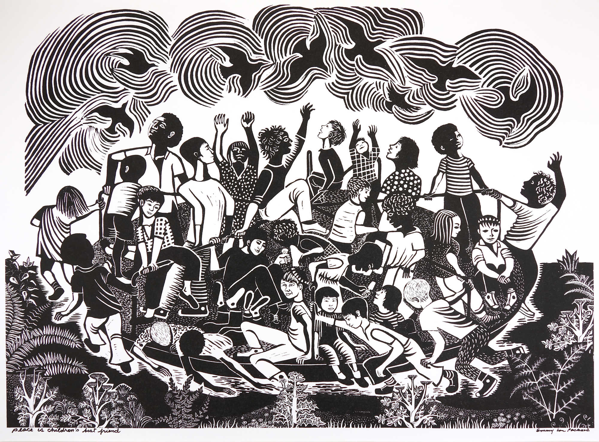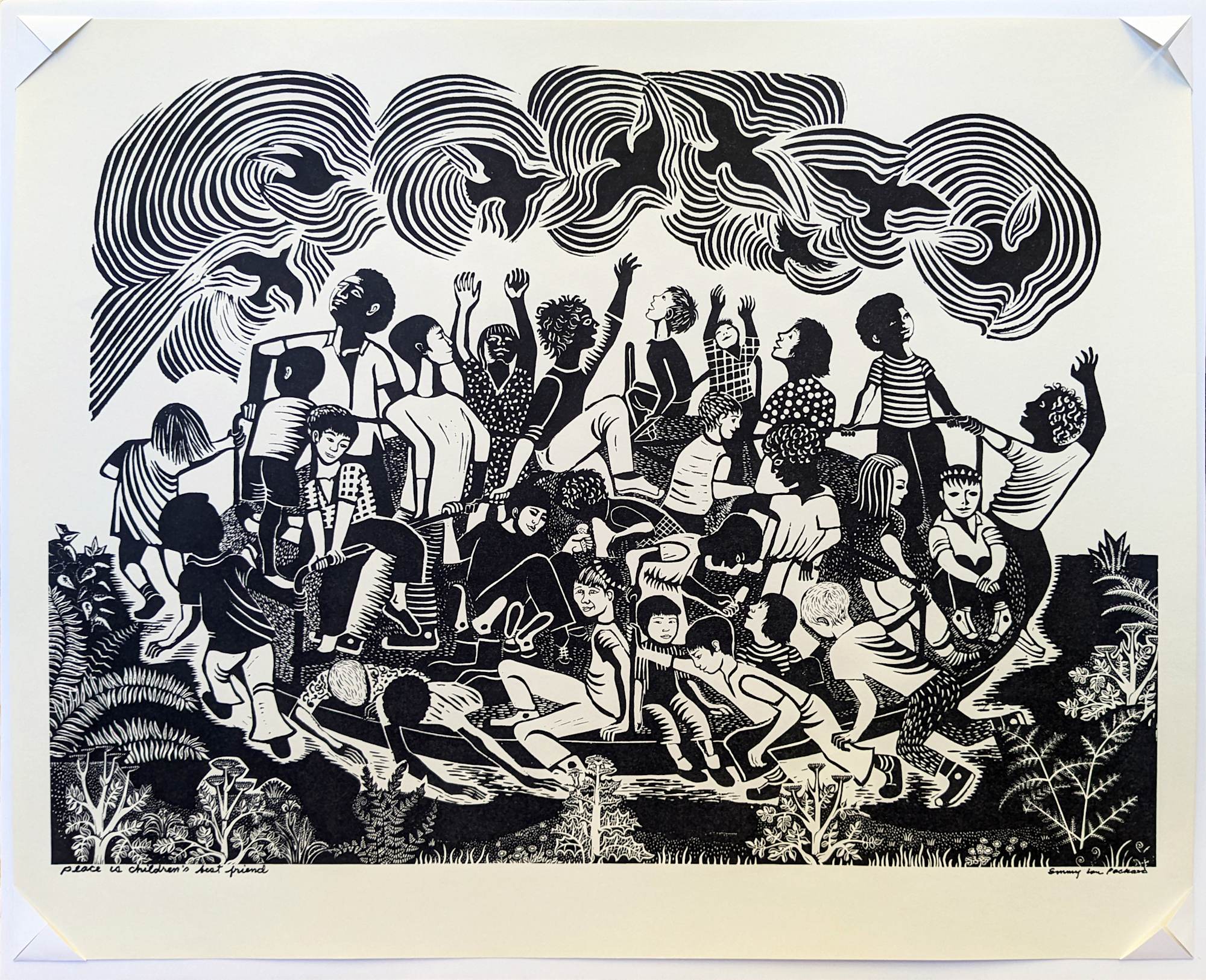 This is a "vintage reproduction" of "Peace is Children's Best Friend". While we are not certain of the process used to replicate this print, we are referring to this class of work as being a "Vintage Reproduction". This is not an original handmade print, but a copy of the original print and was produced for the artist Emmy Lou Packard herself. This print has not previously been privately owned and is in excellent condition. This piece came to the MAC through a generous donation by Don Cairns and the Packard Family Estate.