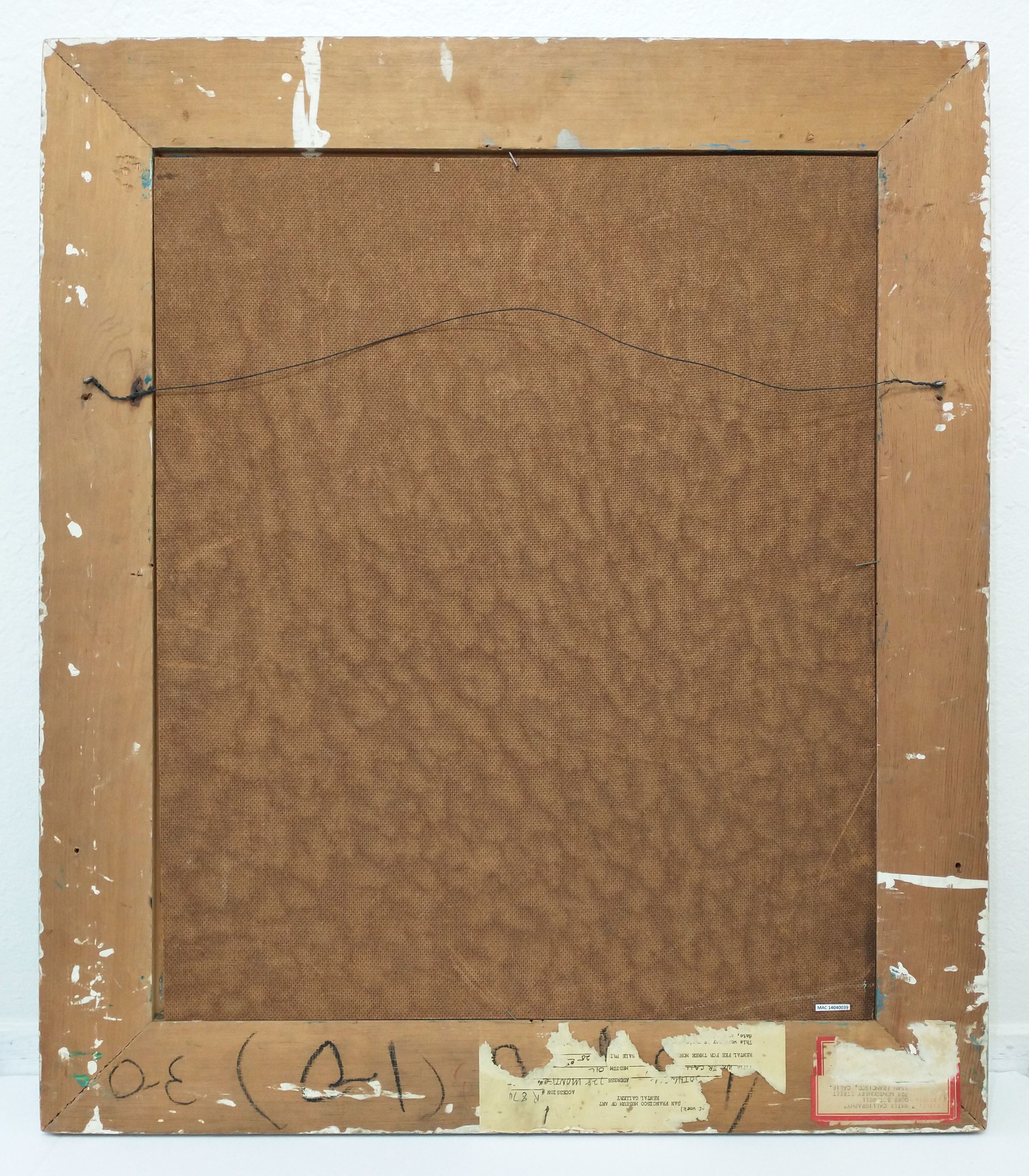 This is a framed original oil painting by Dorr Bothwell. Glued onto the back of the frame is a torn document stating the the piece had been consigned by the San Francisco Museum of Art and was titled, "Water Calligraphy". This frame must have been repurposed. This work was donated to the Mendocino Art Center as "Untitled". In a recorded lecture done at the San Francisco Art Institute in 1996 Dorr Bothwell describes this painting as being titled "Perfumed Night" and states, "this is my favorite painting lost between then and now". This wonderful discovery and more about this painting can be heard between 1:01:30 and 1:02:52 at: https://drive.google.com/file/d/1-kg1pdvP2Cry7Sa0p2NXaEaLPaTIw1wV/view?usp=sharing