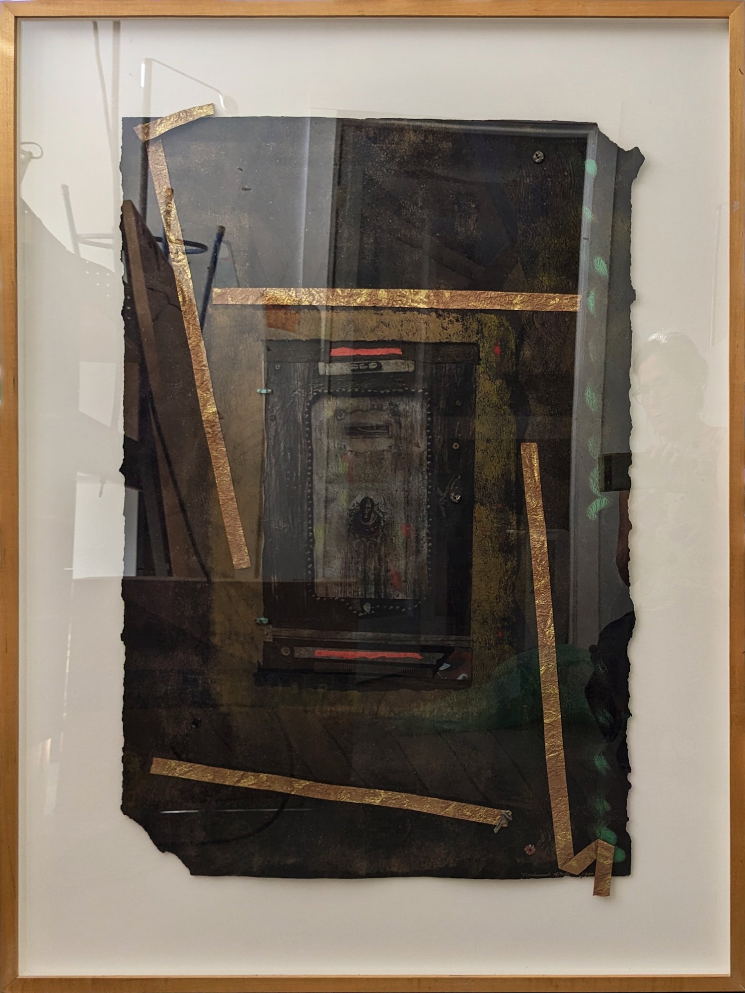 Abstract with picture encased in transparent film with gold strips of paper and other objects.