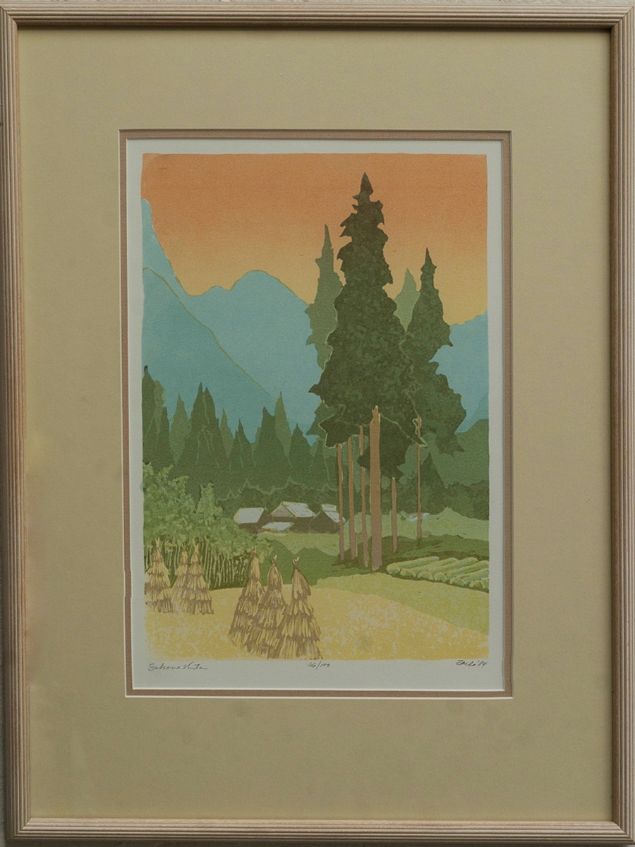 This is a framed original, signed print by William Zacha. This print is part of a larger body of work entitled, "Tokaido Journey". This piece came to the Mendocino Art Center through a donation by Thomas & Nancy Harrington.