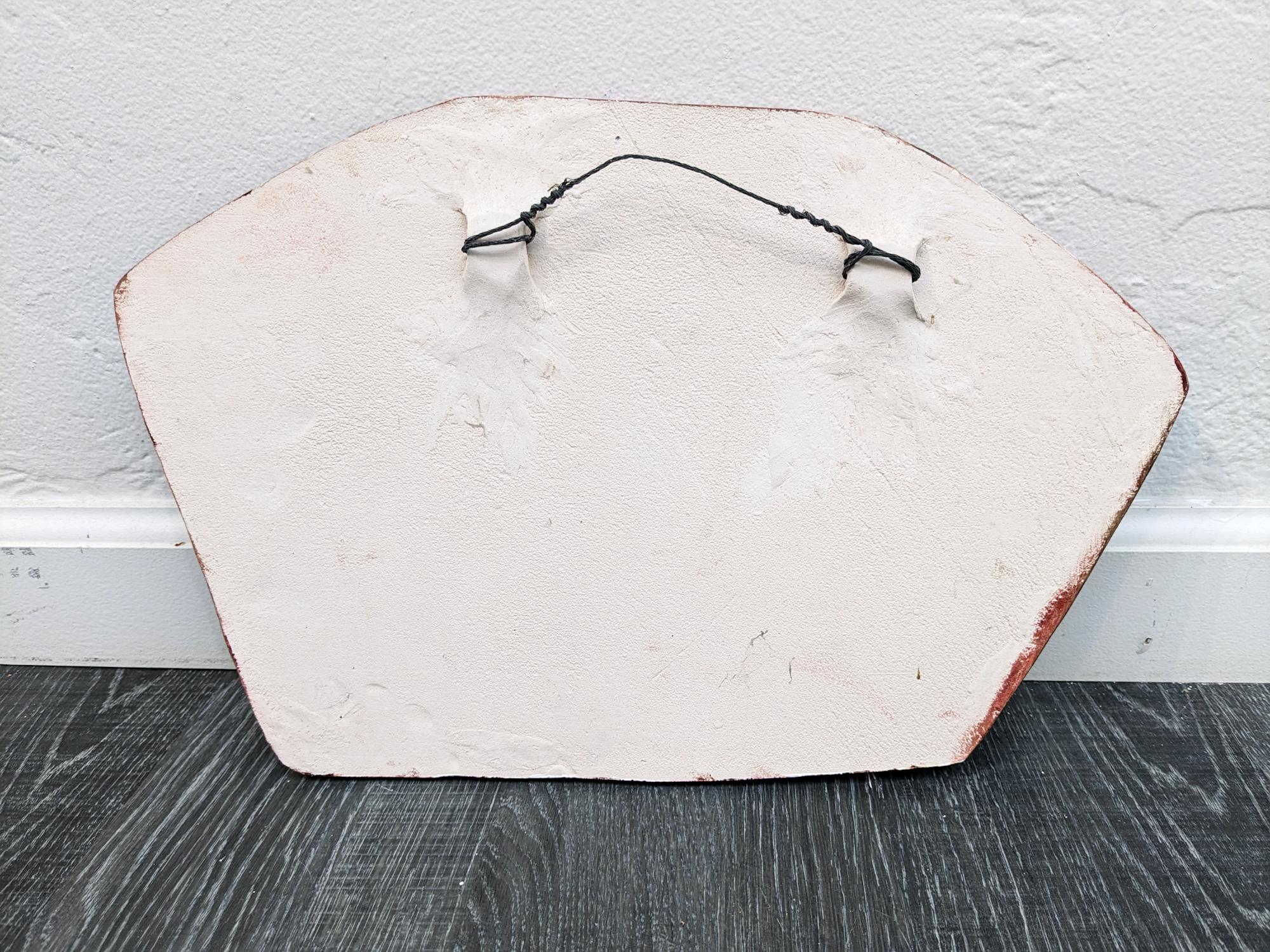 Shaped ceramic panel of stage like setting with couching naked male figure on red floor with single lamp above with woman's face emerging from bottom center.