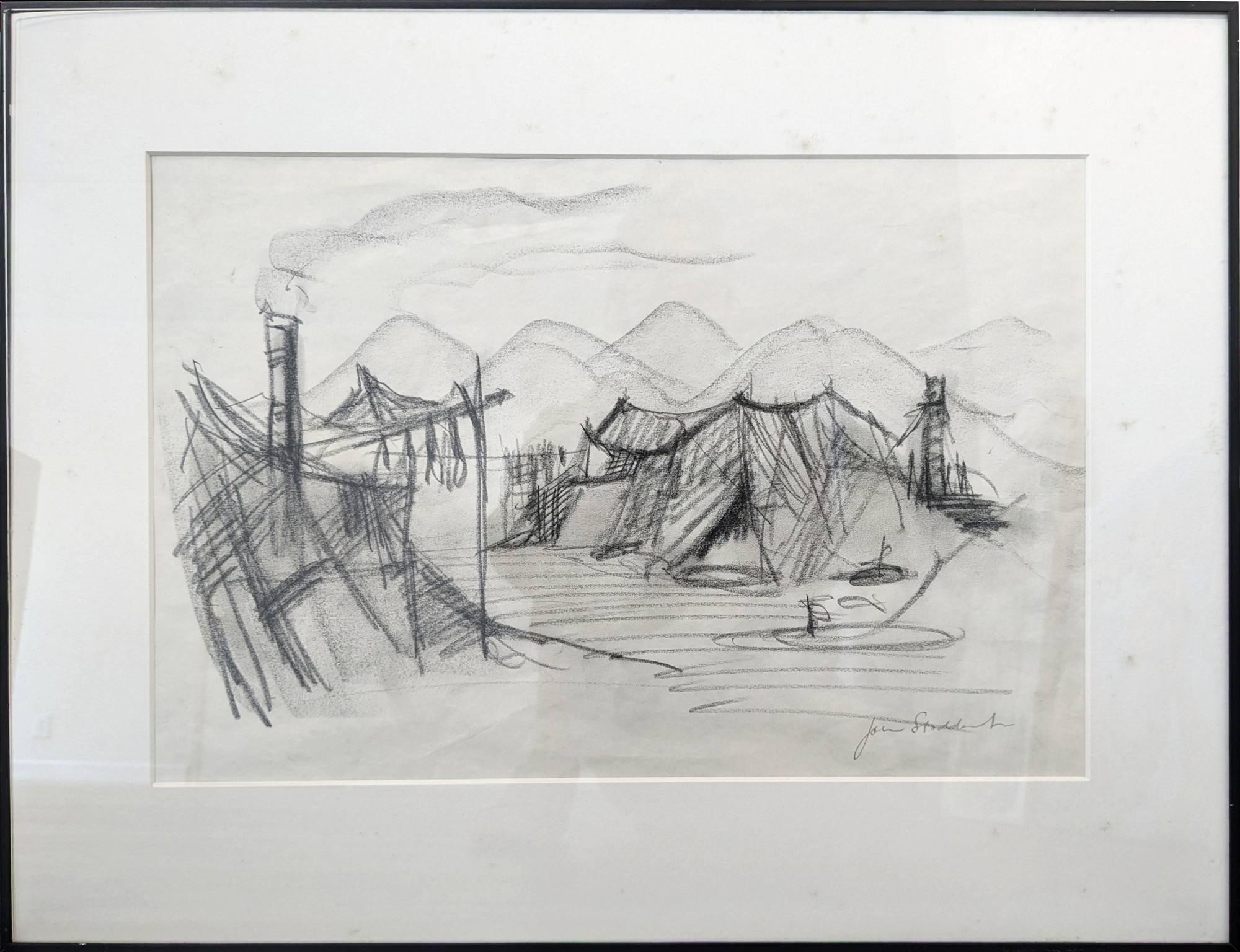 Old time camp with hills and bridge in the distance. We are unsure of the artist that made this work as the signature is not entirely clear.