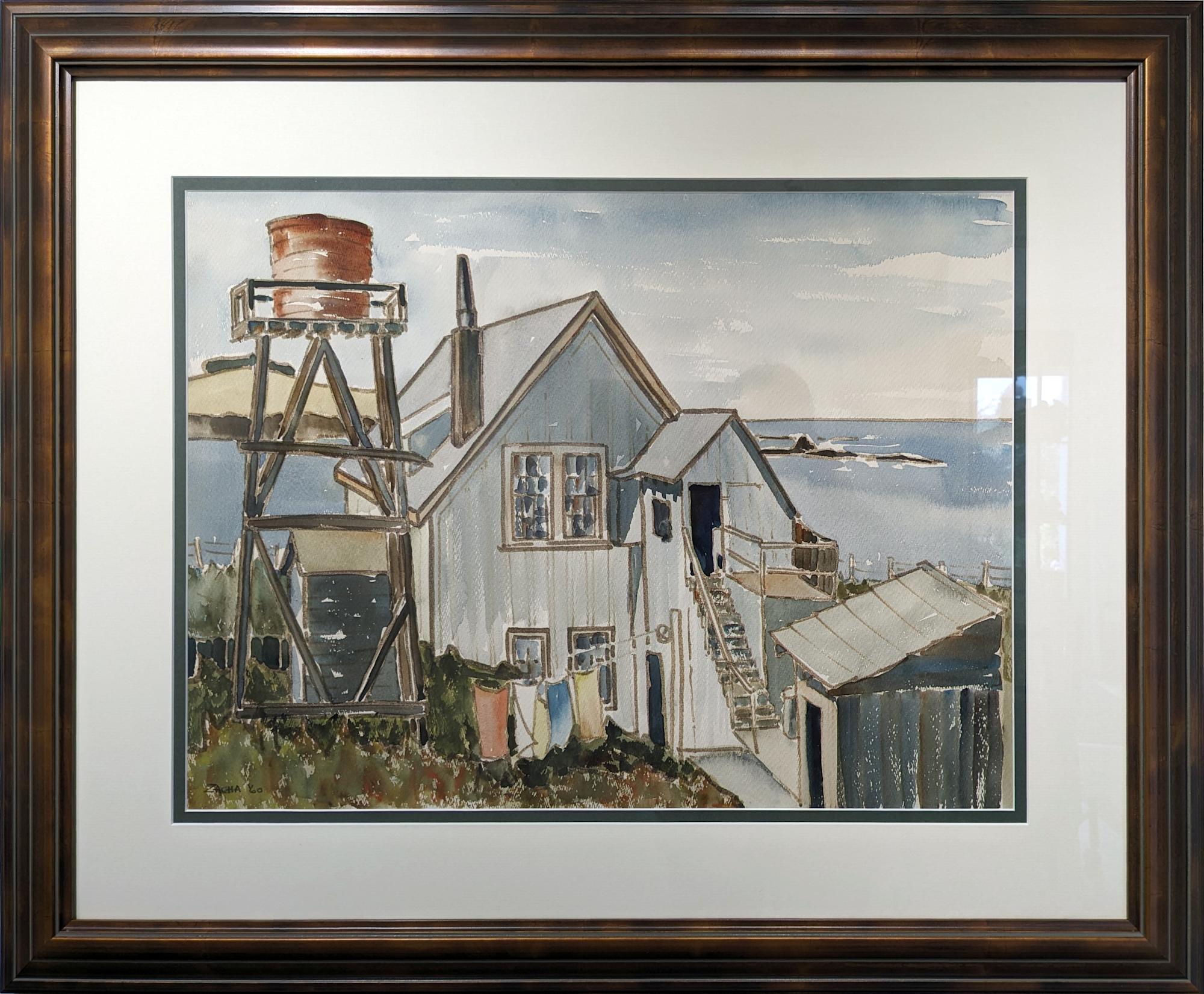 This is a framed original watercolor by William Zacha, the founder of the Mendocino Art Center.