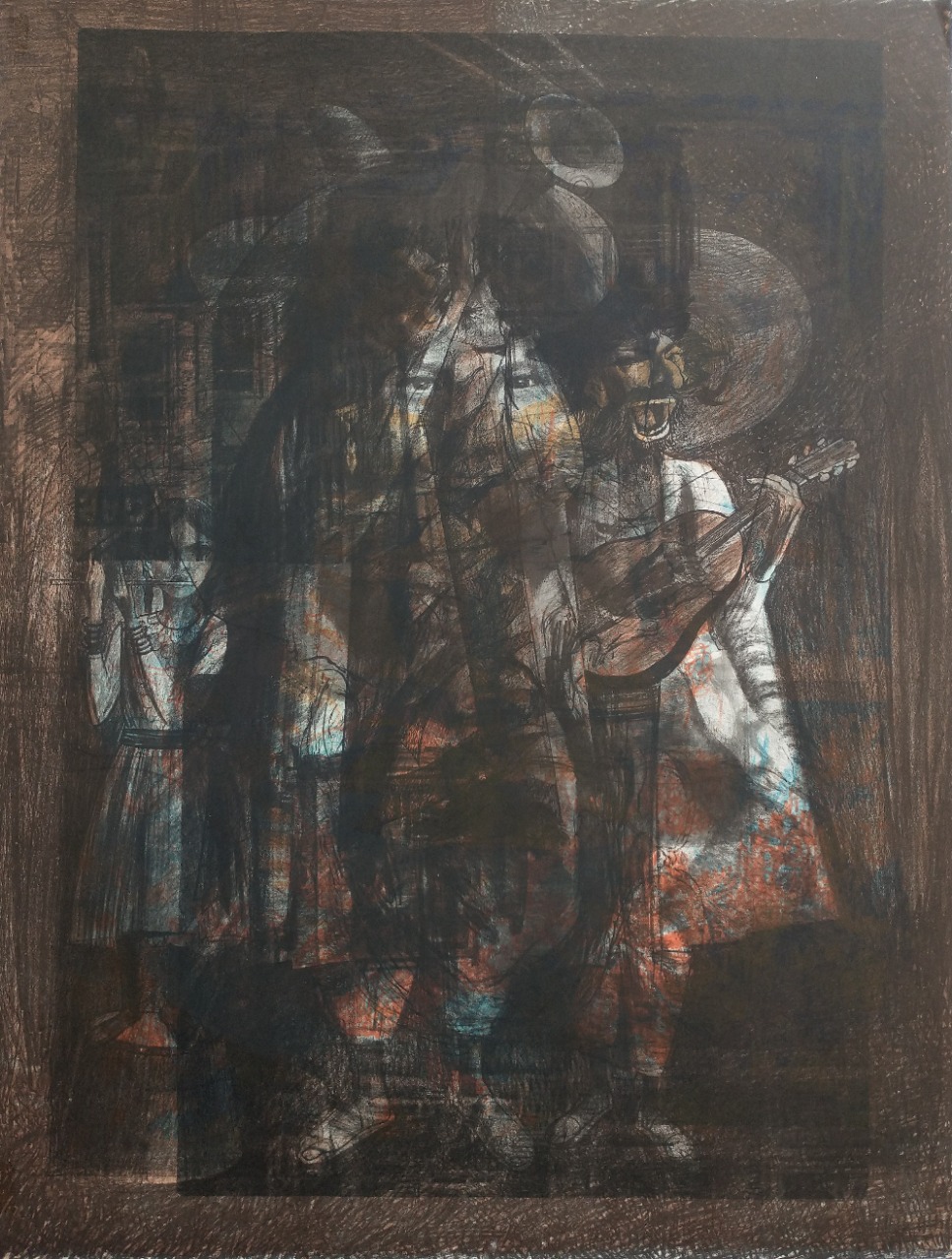 This is an original work on paper by Jan Stussy. This artwork has not previously been owned privately. This artwork is two sided. One side shows an abstract horse and rider. The other side shows a highly detailed drawing of musicians.