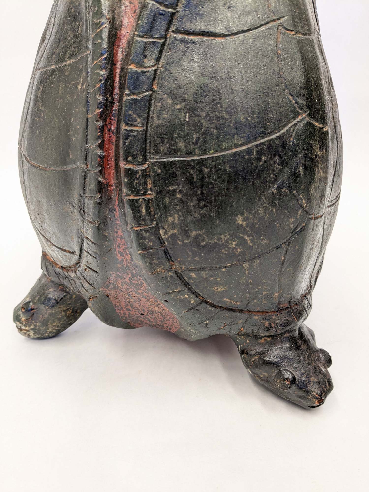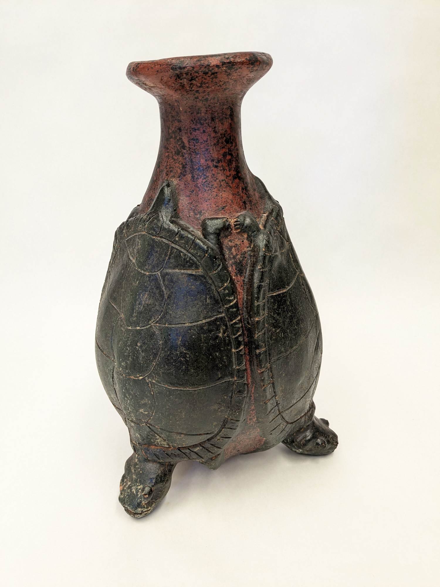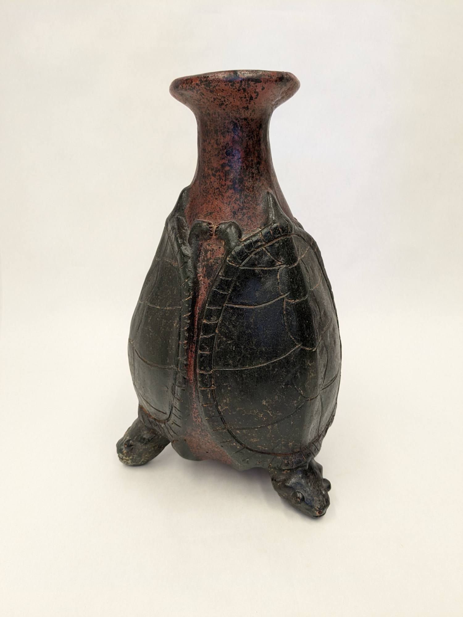 Ceramic vase with a three turtle motif and heads forming the feet of the vase.