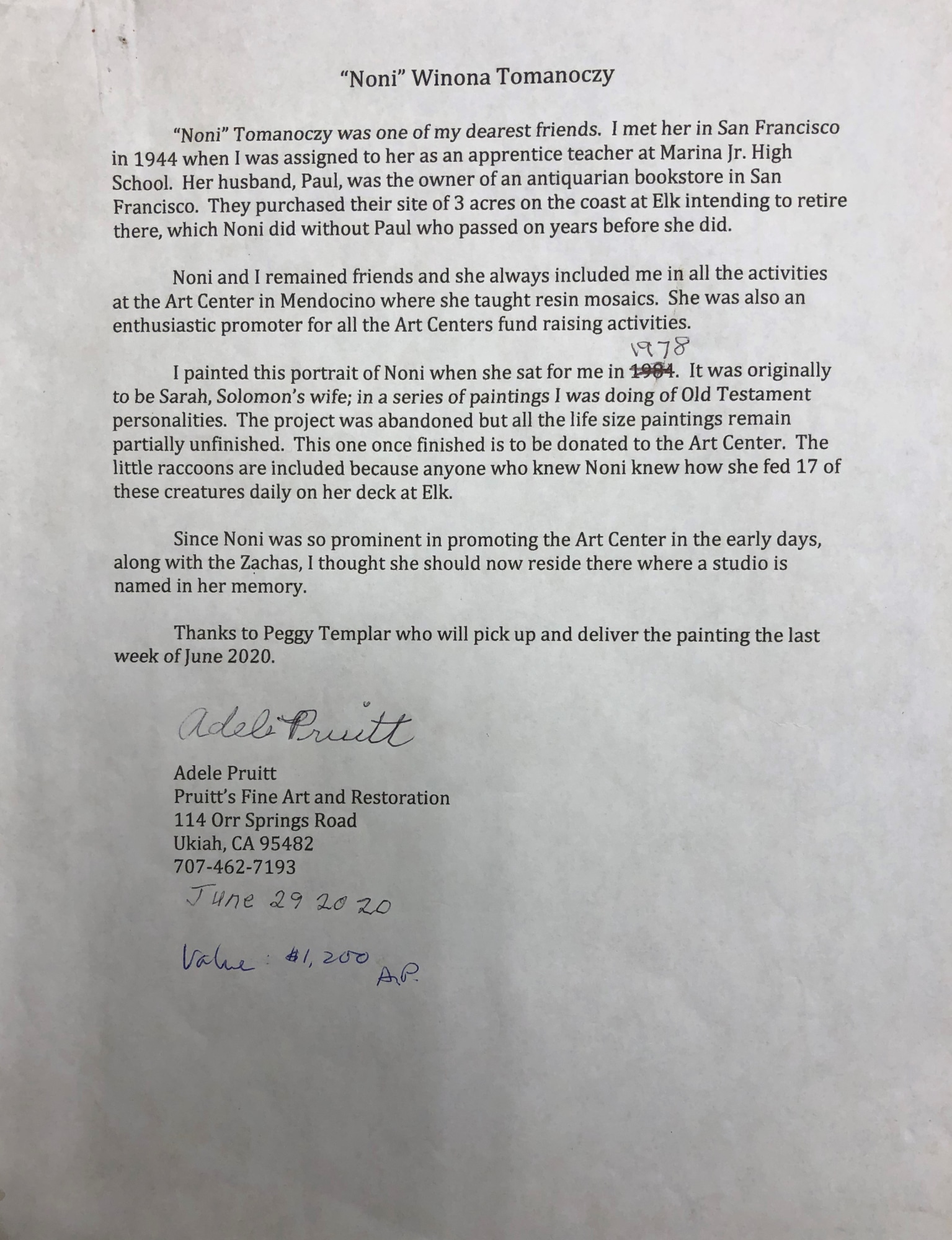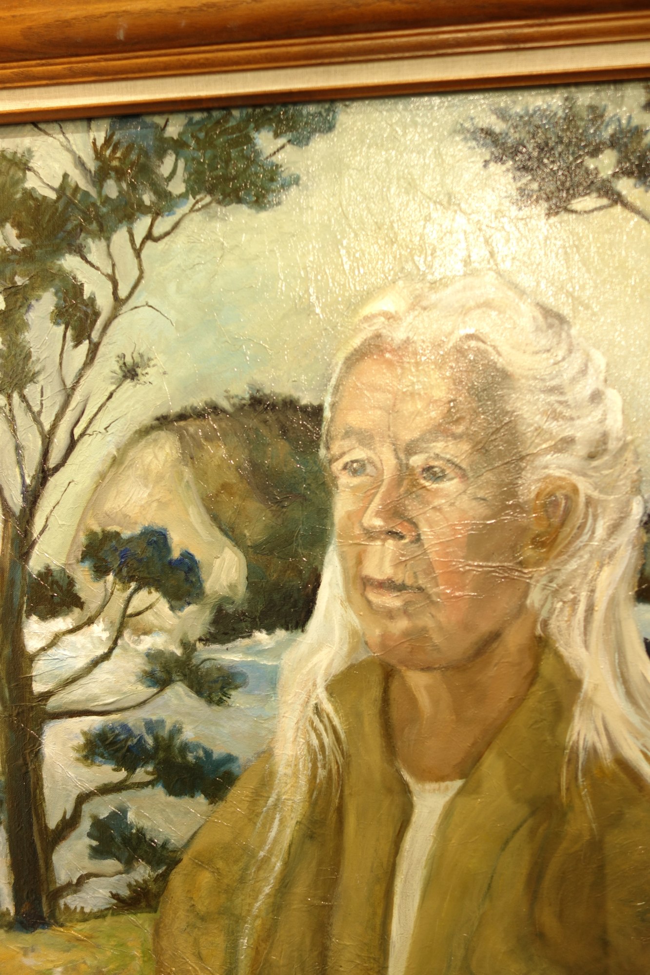 This large painting of Winona Tomanoczy was donated by the the artists that painted this painting, Adele Pruitt. The subject of this painting, Winona Tomanoczy is the namesake of the "Winona fine art and fibers studio" at the Mendocino Art Center. Adele Pruitt is a artist, art educator, and gallery owner in Ukiah, CA.