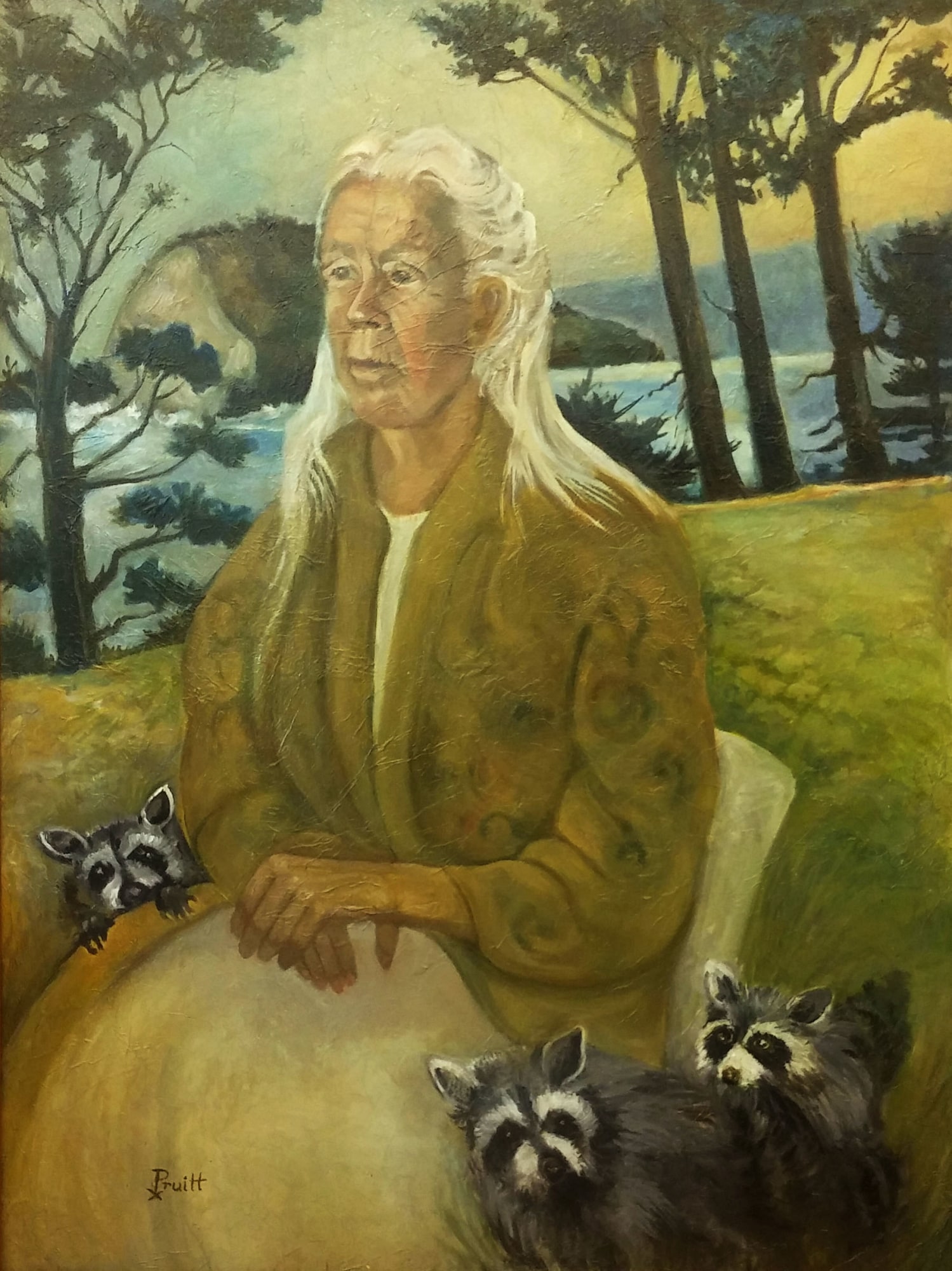 - Subject Matter: Older woman on headlands with racoon
