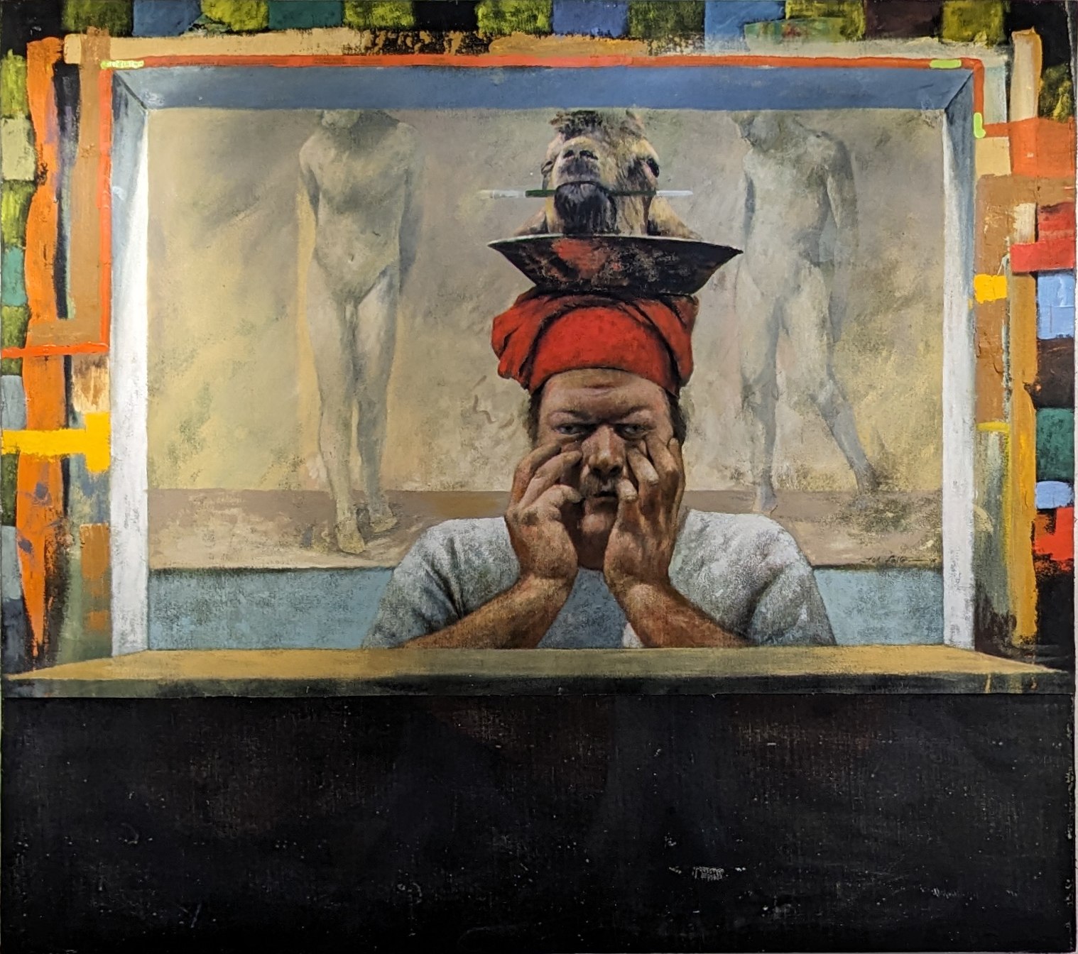 - Subject Matter: Man with red headwrap with bowl on head containing camel head with paintbrush in mouth.