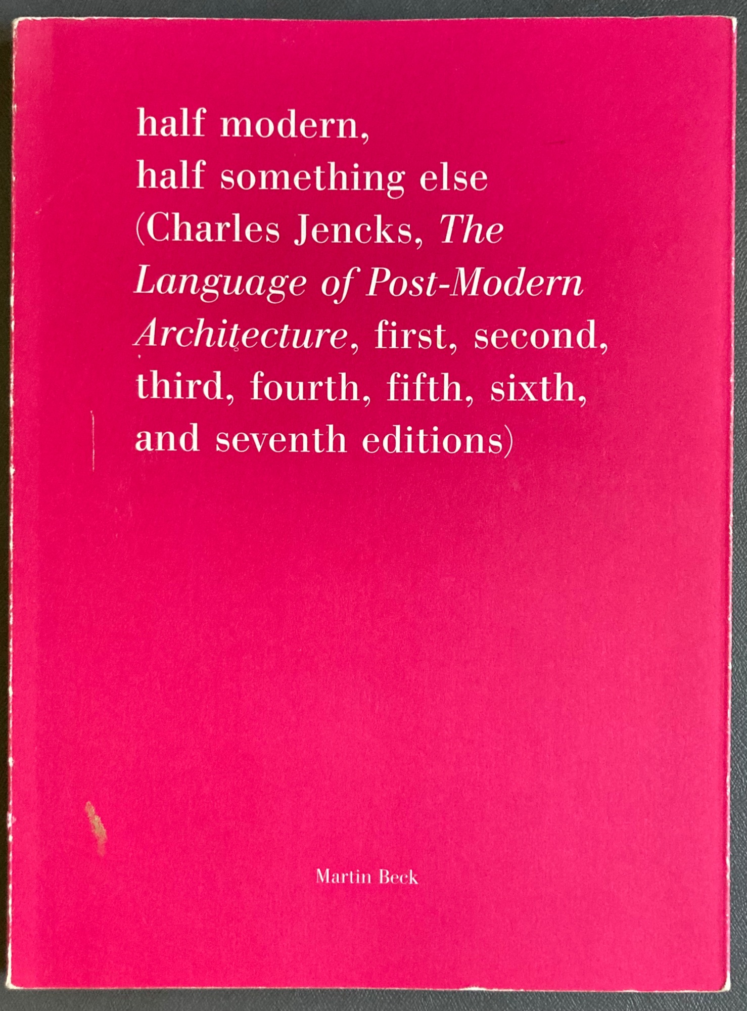 - Half Modern, Half Something Else (Charles Jencks, The Language of Post-Modern Architecture, first, second, third, fourth, fifth, sixth, and seventh editions)