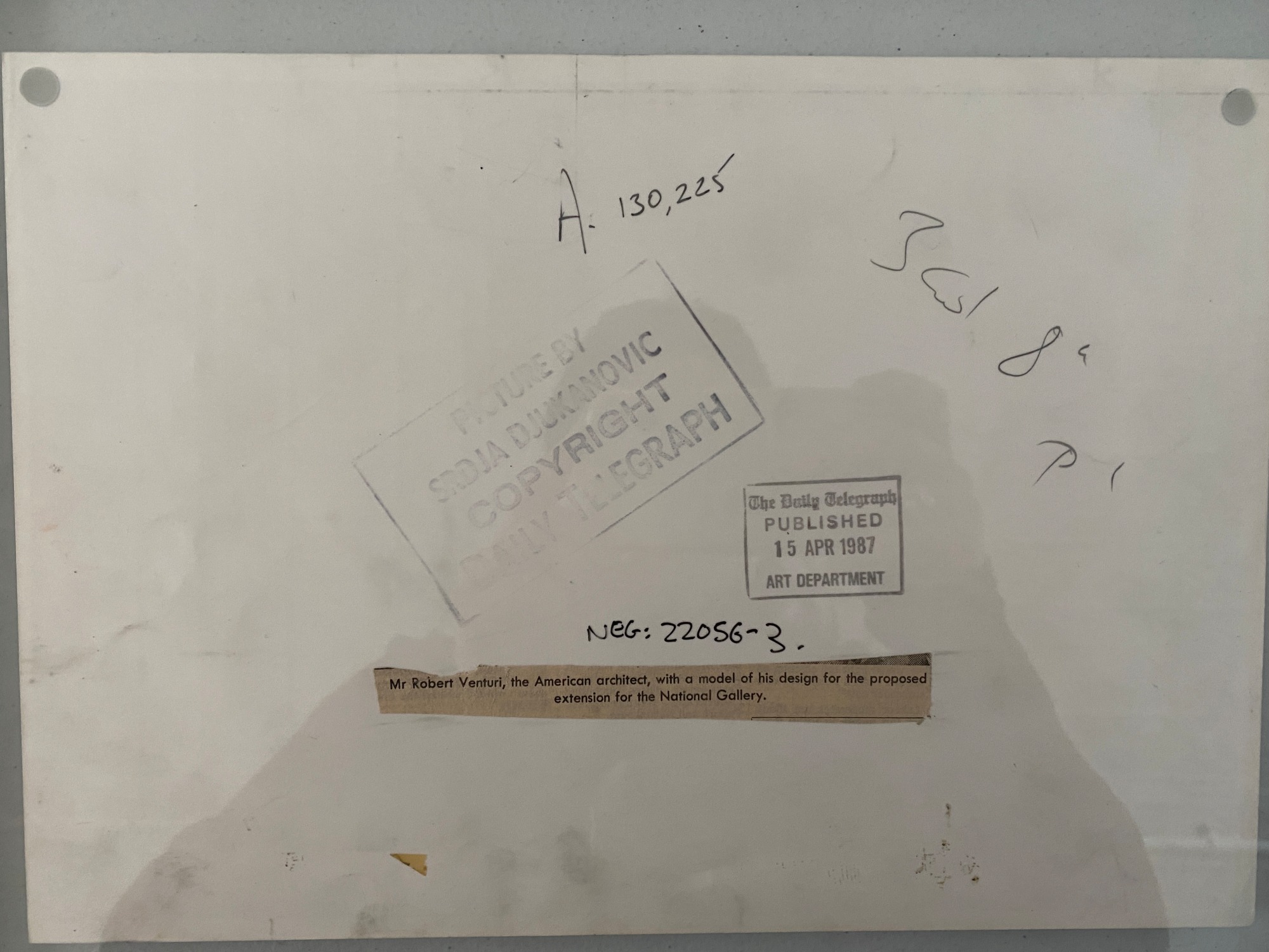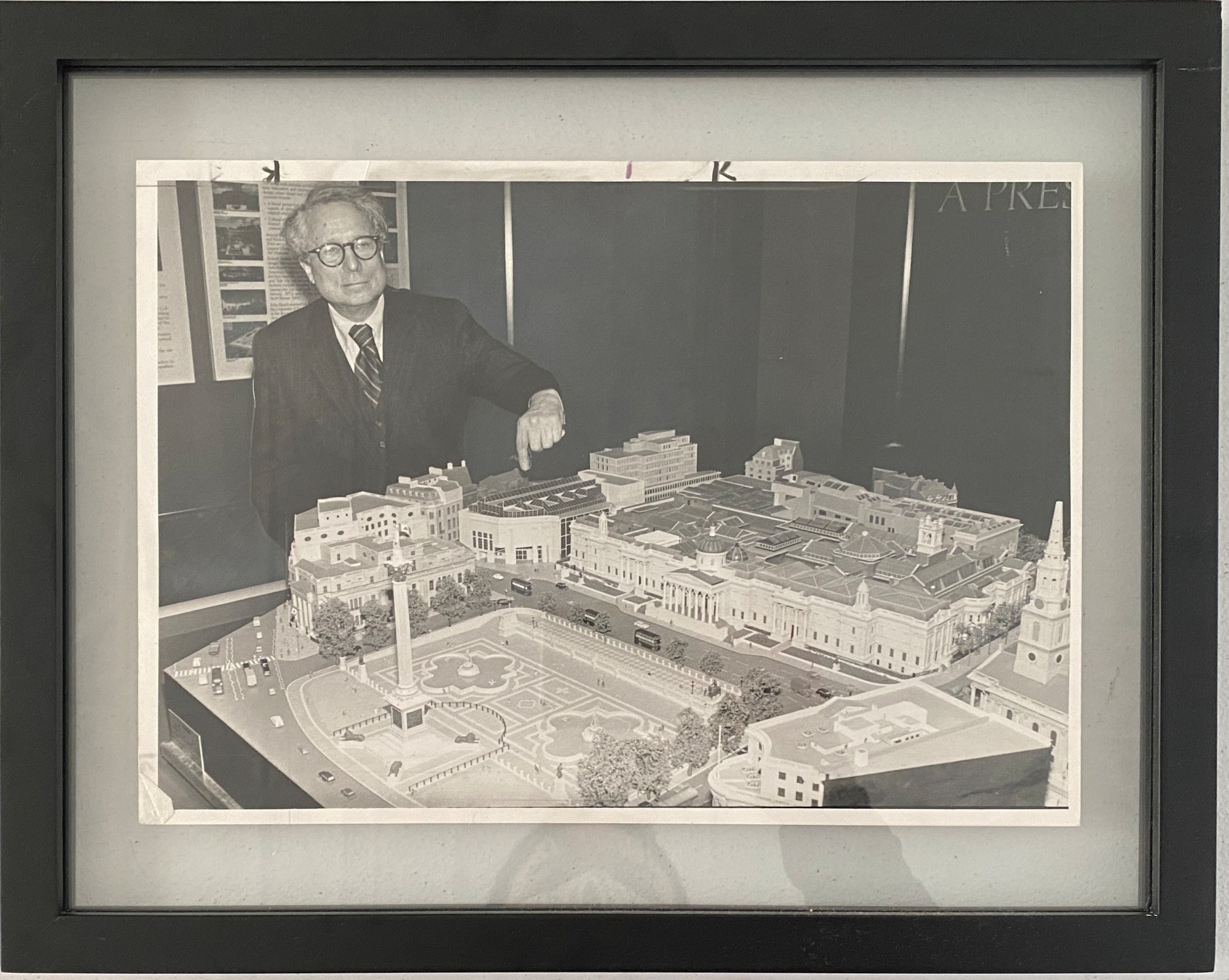 Robert Venturi with model of his design for the proposed extension for the National Gallery