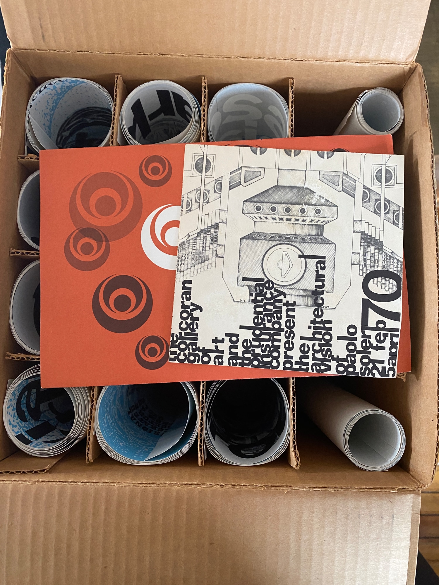 This box and its contents make up the catalog for Documenta: The Paolo Soleri Retrospective, an exhibition held at the Corcoran Gallery of Art in the spring of 1970. Born in Turin in 1919, Soleri is an architect and the founder of Arcosanti, a town in the Arizona desert devoted to the exploration of the relationship between ecology and architecture. In addition to a printed catalog, the box also contains sixteen long drawings of Soleri's work, rolled and stacked in a cardboard housing. Unfurled, the drawings offer a tour of Soleri's projects, and propose a new format for the genre: the catalog as exhibition.