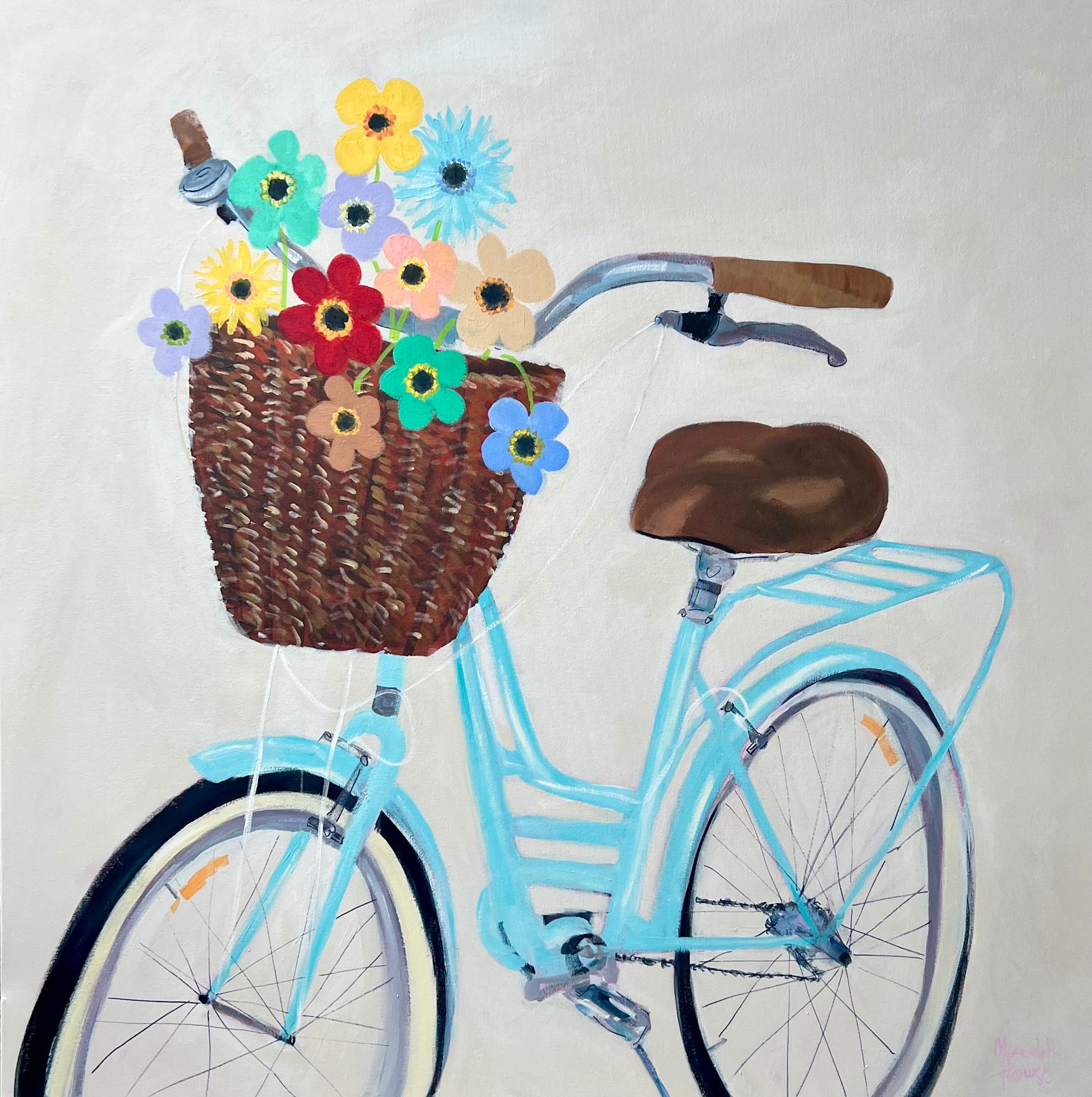Created with a nostalgic flair, '70’s Girl' by Meredith Howse celebrates the carefree spirit of a bygone era. At the heart of the composition is a vintage-style blue bicycle, elegantly poised against a soft, pale beige background. A charming woven basket perched on the handlebars brims with whimsical, retro-inspired floral illustrations — a joyful nod to 1970's design.