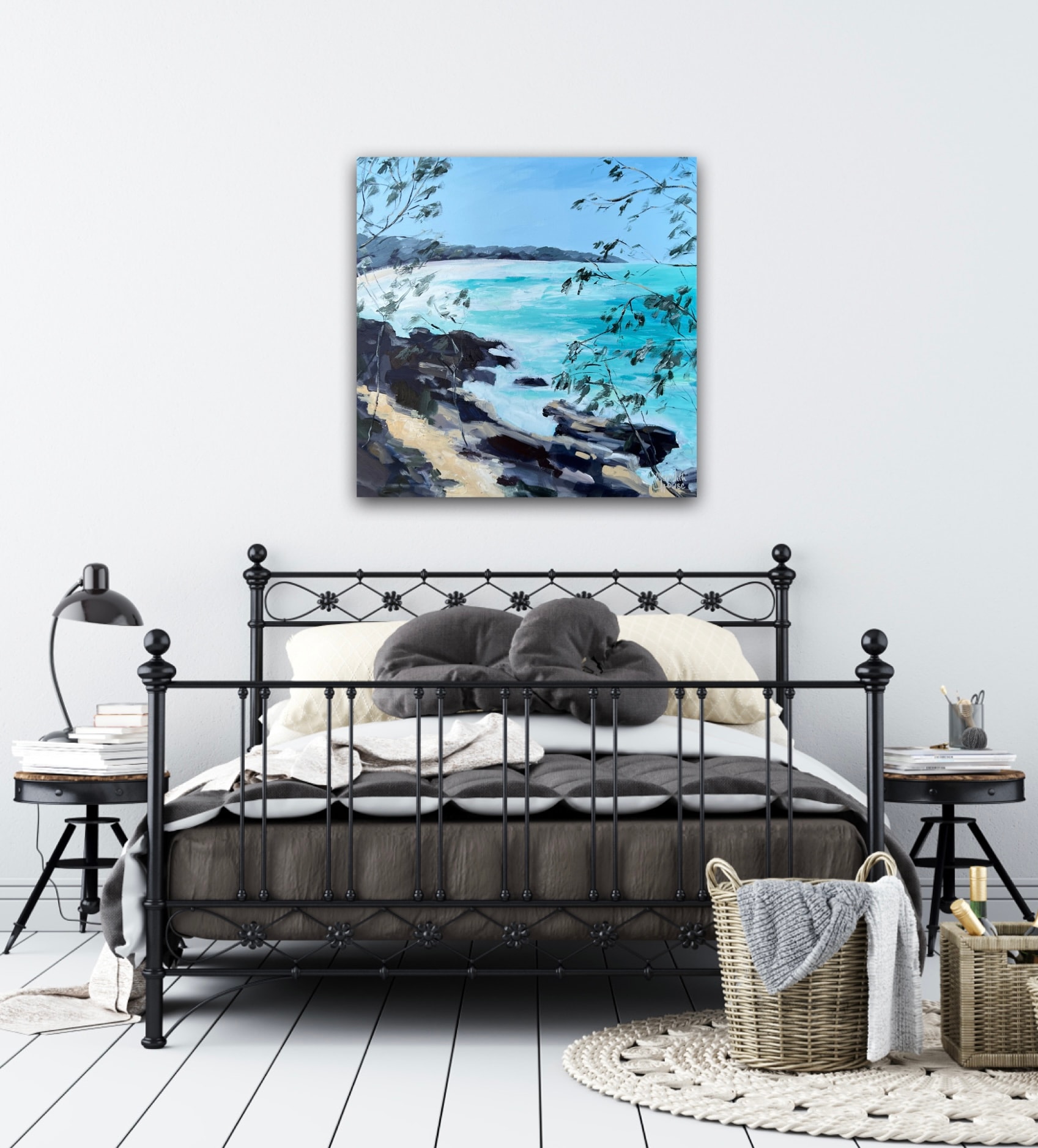 Alexandria Bay Noosa is a breathtaking tribute to the rugged beauty of Noosa National Park. The painting is a square canvas format, with the artwork continuing around the edges, creating a sense of continuity and flow.