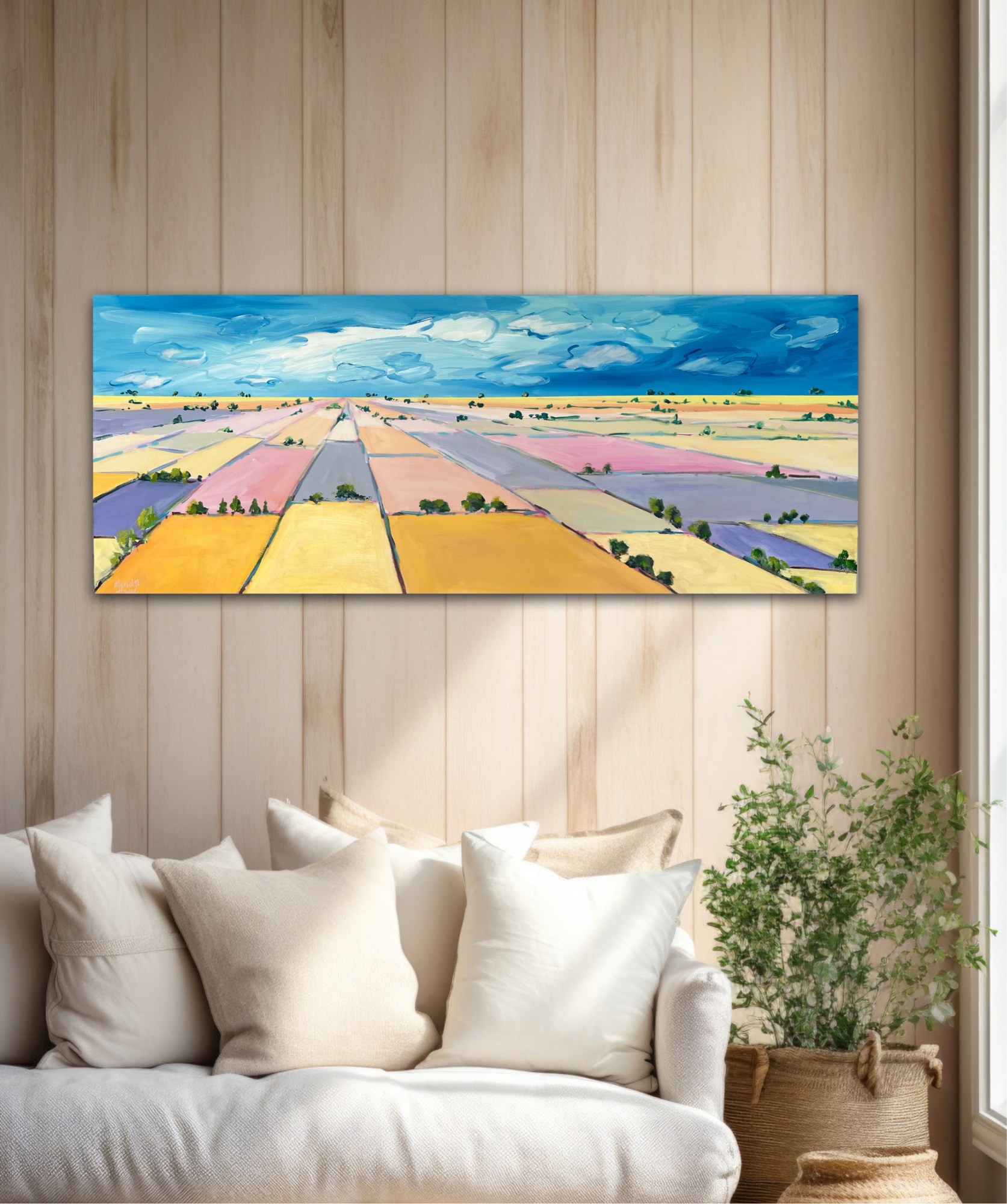 'Big Land' from the As Far as the Eye Can See series by Meredith Howse is a vibrant testament to the beauty of pastoral landscapes. Drawing inspiration from the expressive brushwork and bold colour palette of artist Raoul Dufy from the Fauvism movement, Howse breathes life onto the canvas.