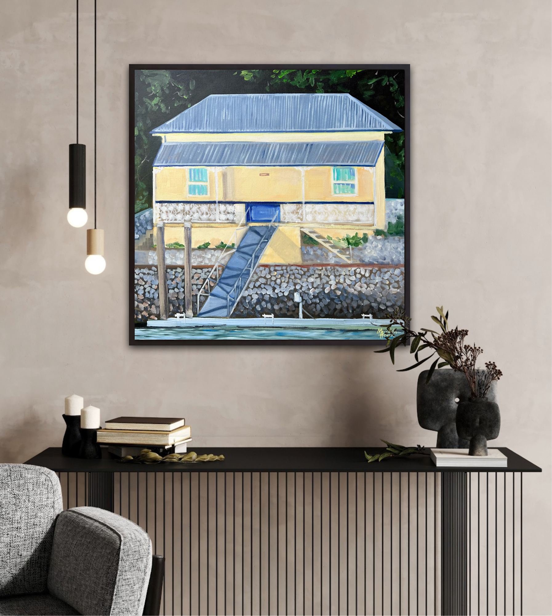 A contemporary stylised piece by Meredith Howse. Showcasing architecture of Hawthorn on the Brisbane River.