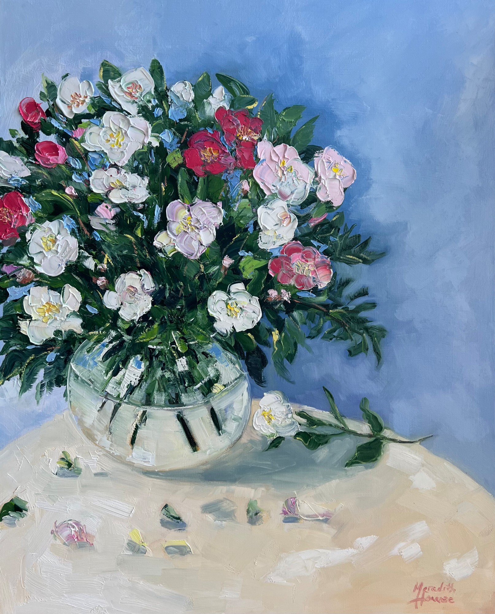 Inspired by Autumn flowers, 'Camellias', rich with textured oil paint and beautiful colours of nature.