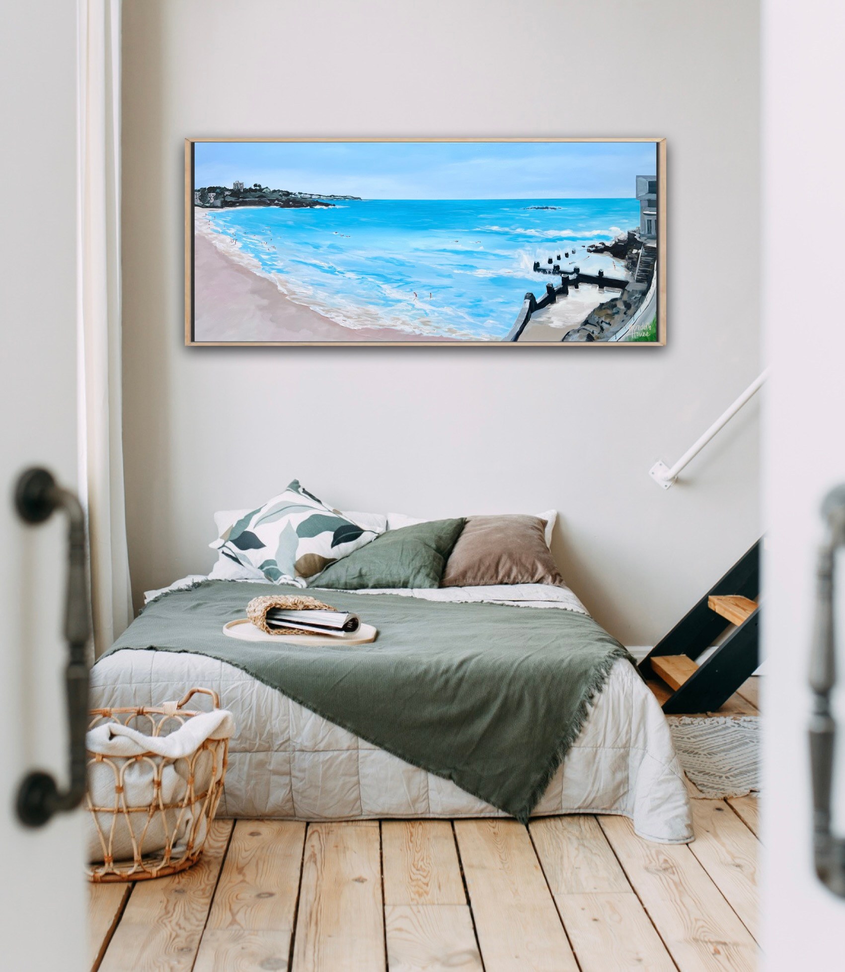 The painting is dotted with swimmers across the bay, in the waves and the ocean pool.