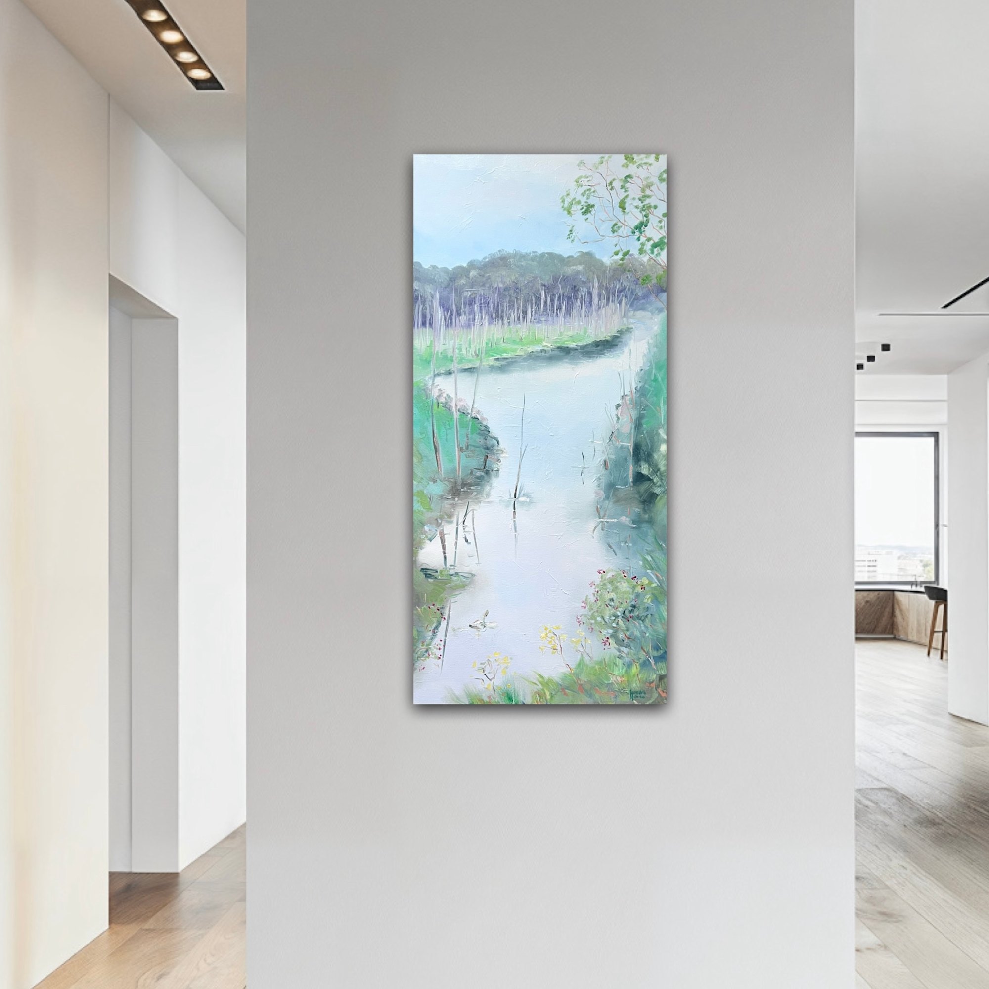 Choosing a long vertical portrait format the artwork encapsulates the water from one end of a turn in the creek to another in the distance.