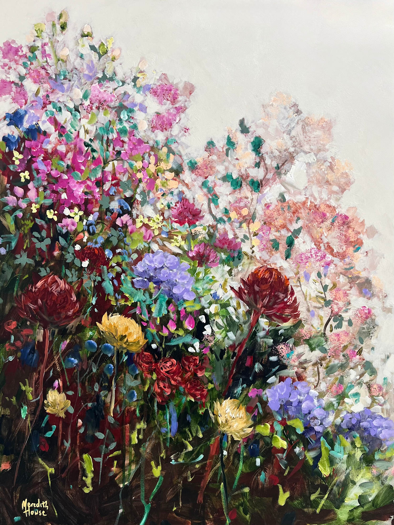 ‘Flower Vintage’, by Meredith Howse transports viewers to the natural beauty of a flower garden. The painting showcases an array of blooms in warm earthy colours.