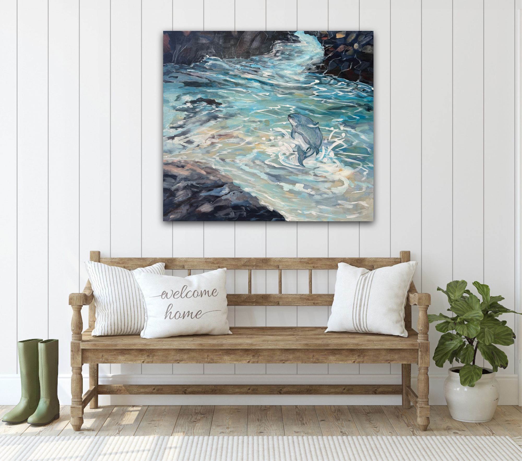 Flying Fish by Meredith Howse is a dynamic artwork inspired by the natural beauty of the rock pools at Noosa Heads National Park. Using a limited palette, the painting captures the energy and movement of water rushing and swirling in and out of the rock formations. The presence of flying fish adds a lively element to the composition, enhancing the sense of motion and vitality.