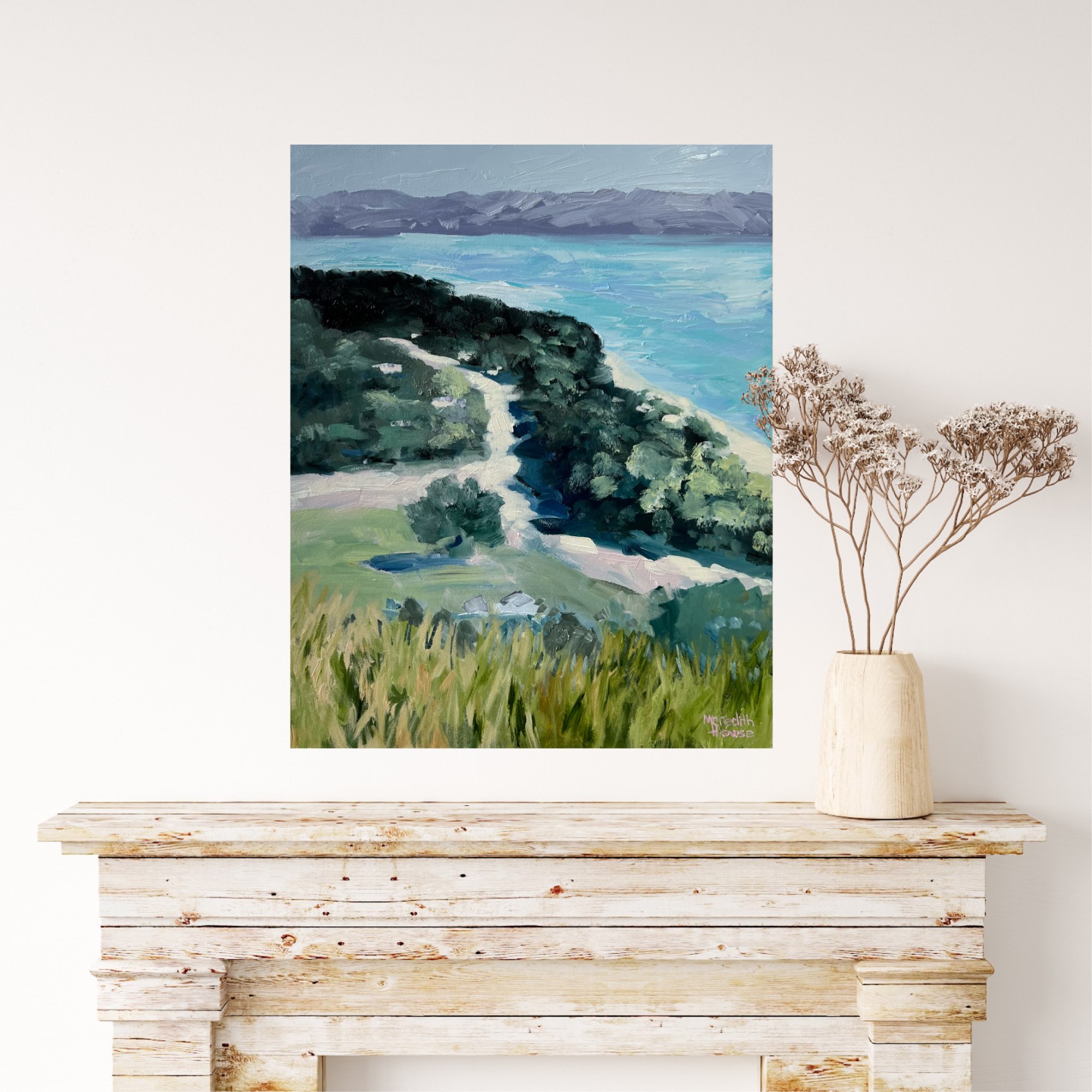 The artist's brushwork adds a sense of movement and spontaneity to the piece with farms, natural ocean inlet, coastal trees, and long grasses of which characterised the area in its earlier years.