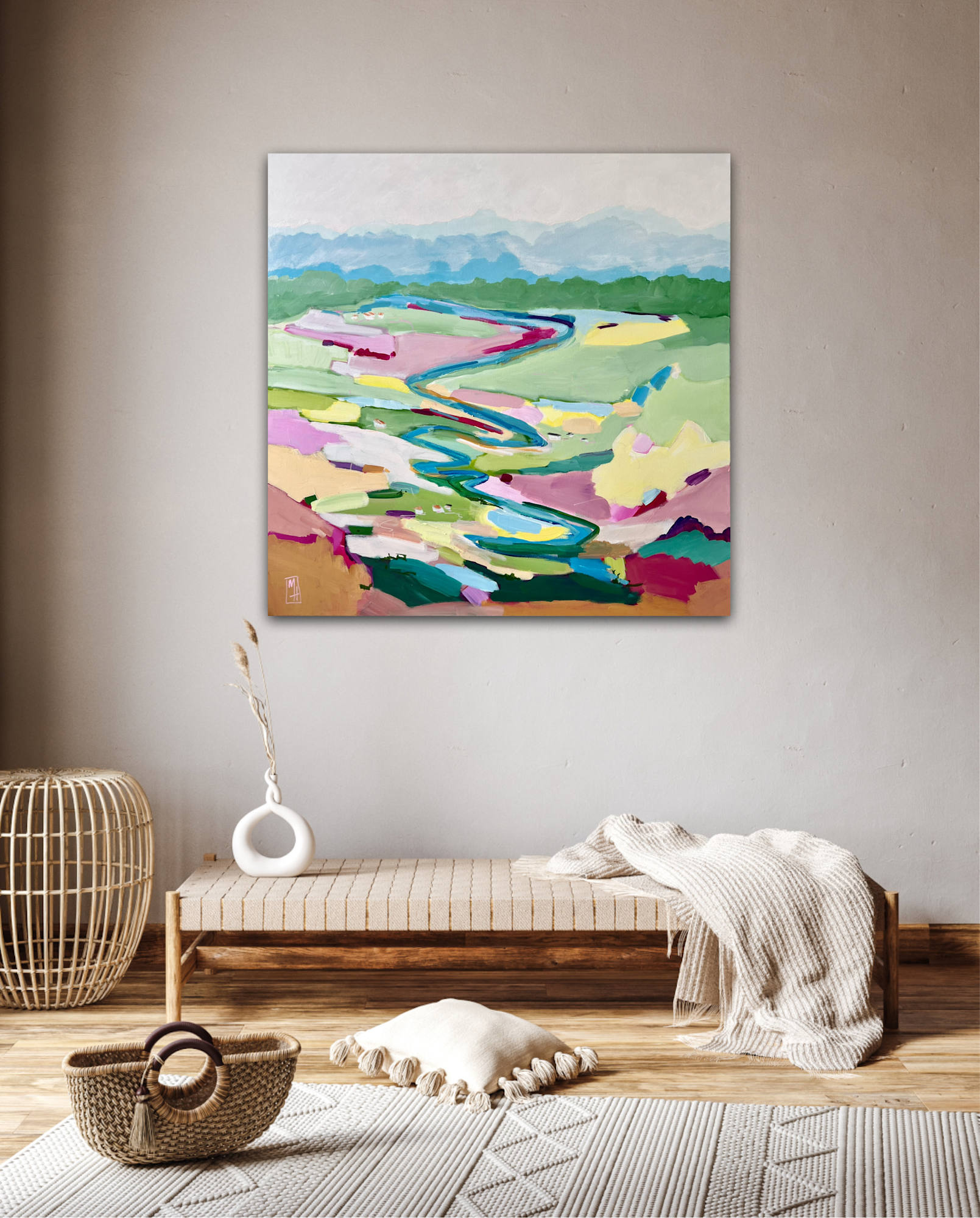 Inspired by the colours of the countryside comes an abstract landscape using rich deep greens, earthy browns, pinks, yellows and warm ochre’s, with a splash of blue to symbolise our rivers, dams and blue sky’s. Using a birds eye view point and a well primed canvas, connections are made between colours and lines.