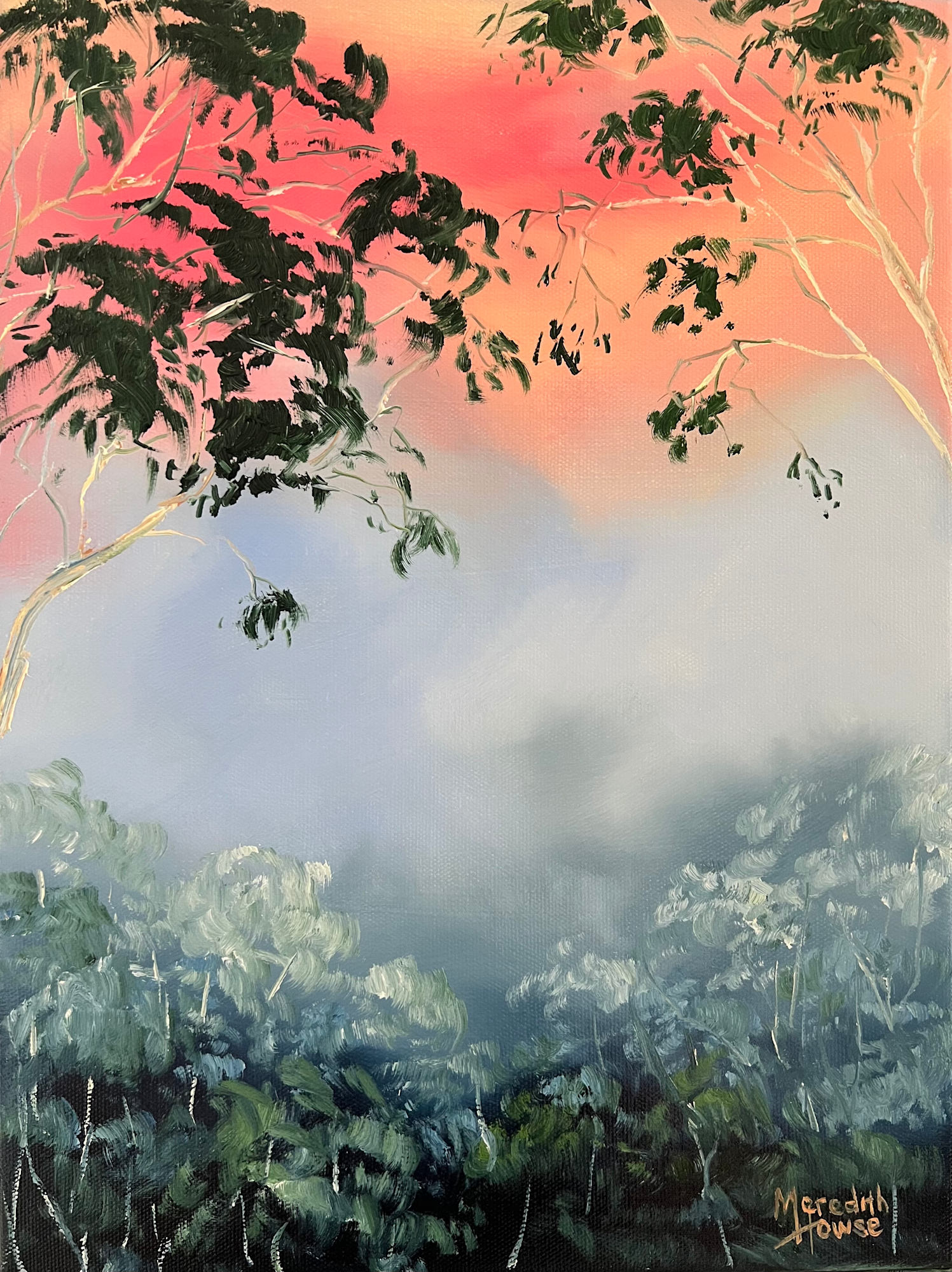 In Illumination at Sunset the artist uses a palette of pinks, orange, blues, greys and greens, to bring the scene to life.